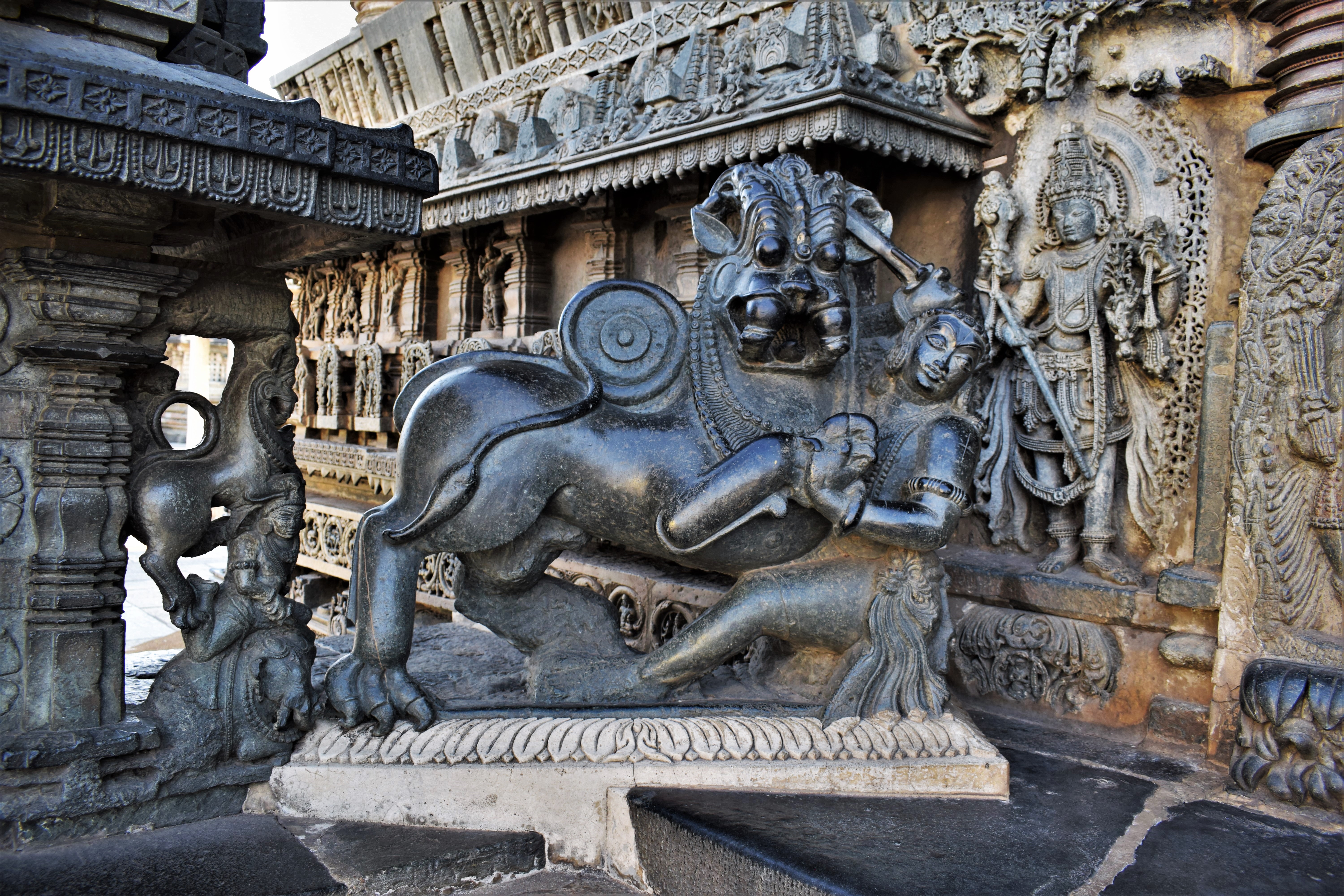 Chennakeshava temple, Beluru, Hoysala symbol of a man named Sala slaying a lion, to the left of the main door Public Deposited