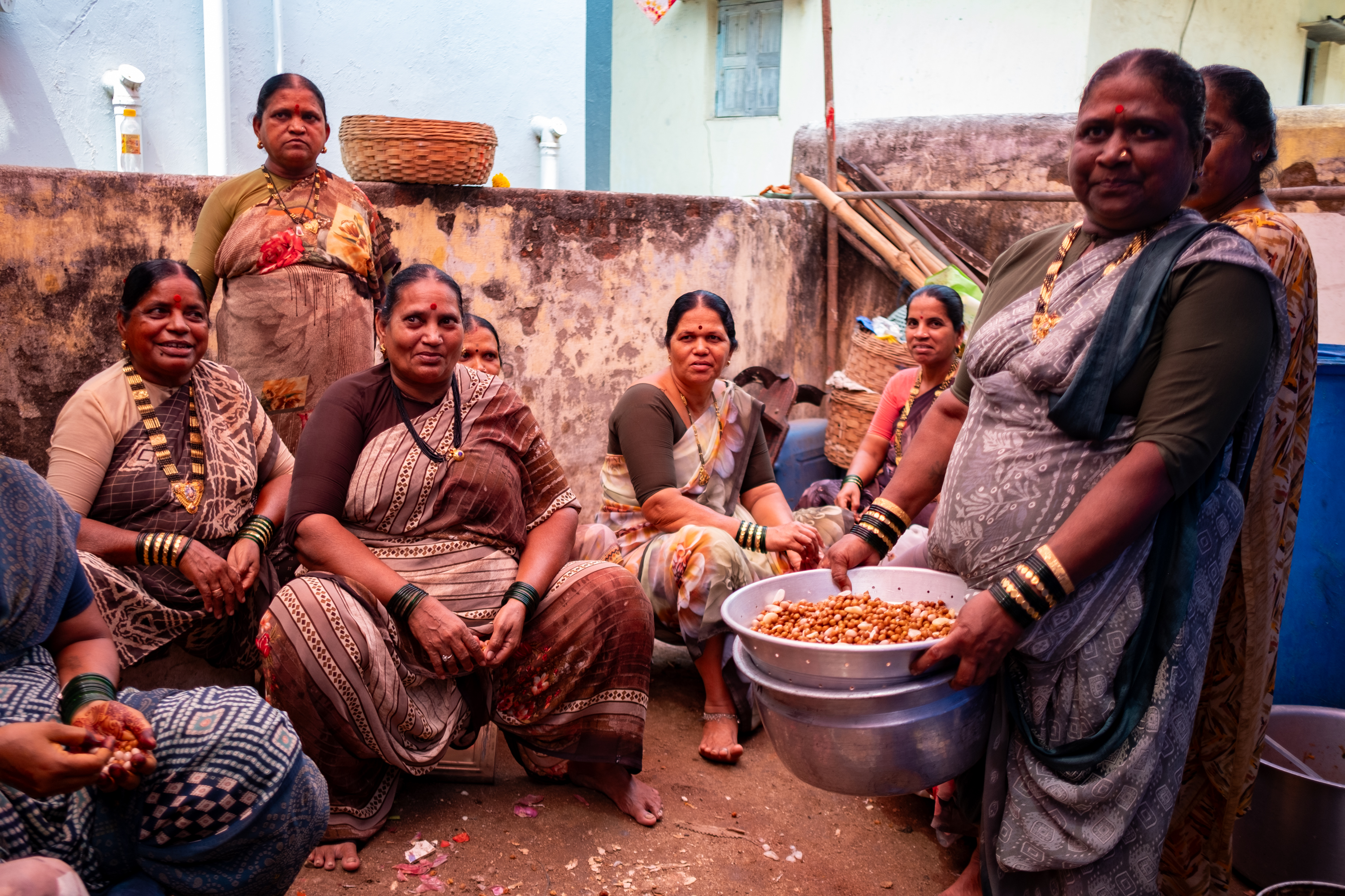 The women gather in the backyard to prepare food for all the guests, fostering a sense of unity and camaraderie among the community as they prepare to welcome the new members into their fold.