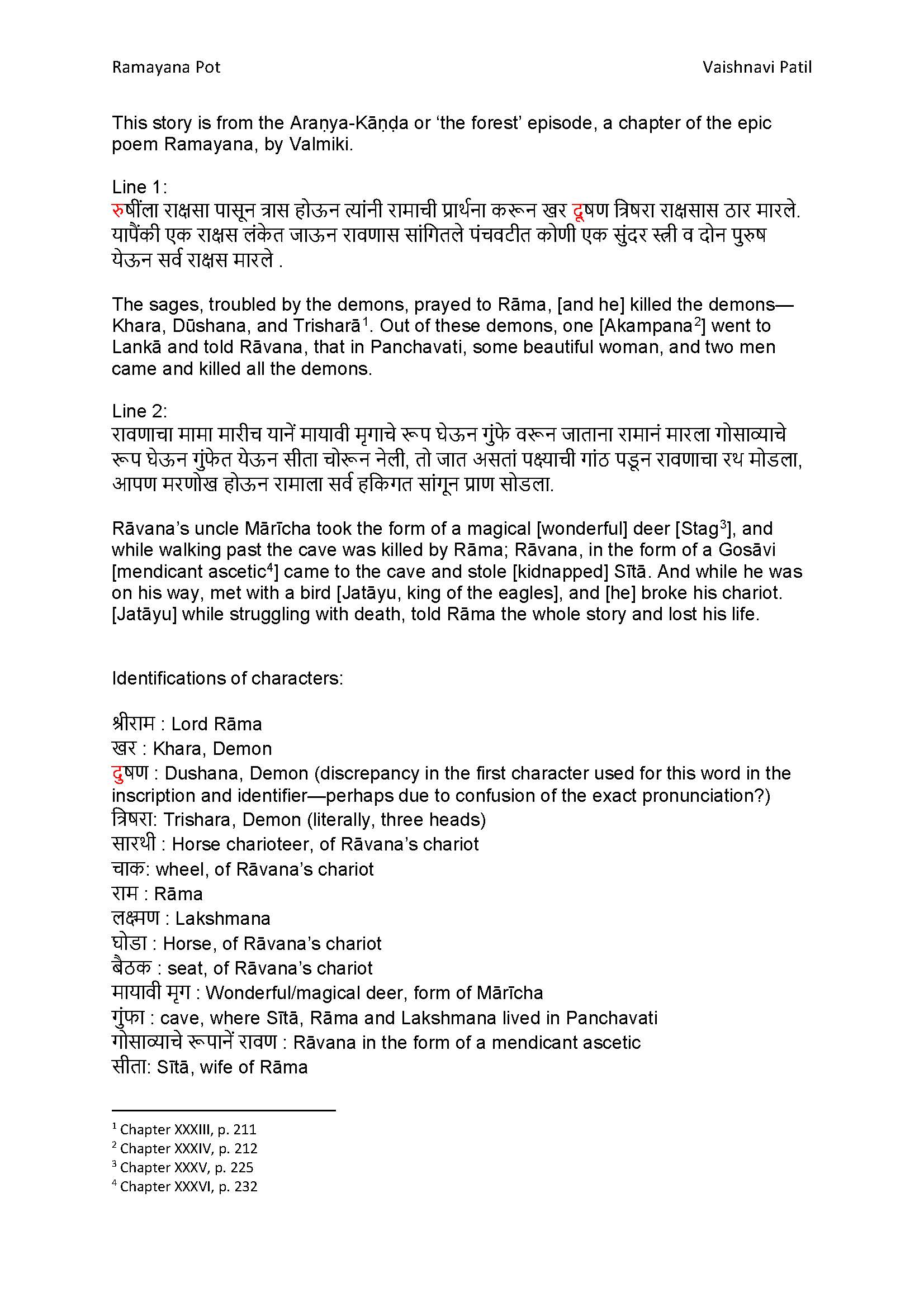 Drawn from the third book (“Aranya Kanda”) of the Ramayana, the elaborate narrative on this vessel depicts key scenes in the Dandaka forest. Created by the Bombay School of Art in an effort to preserve Indian craft, the object features many embellishing motifs drawn from the Buddhist murals of Ajanta. These features include the lotus and pearl band running around the shoulder and the monster faces (kirtimukha), set between the addorsed elephant heads, that spit out a garland of jewels. Although the vase is grounded in the Indian tradition, British neoclassical taste clearly underlies its shape and some of its geometric motifs. Given the scale and inscribed multiscene narrative, this vase may have been produced for the London Colonial and Indian Exhibition of 1886.