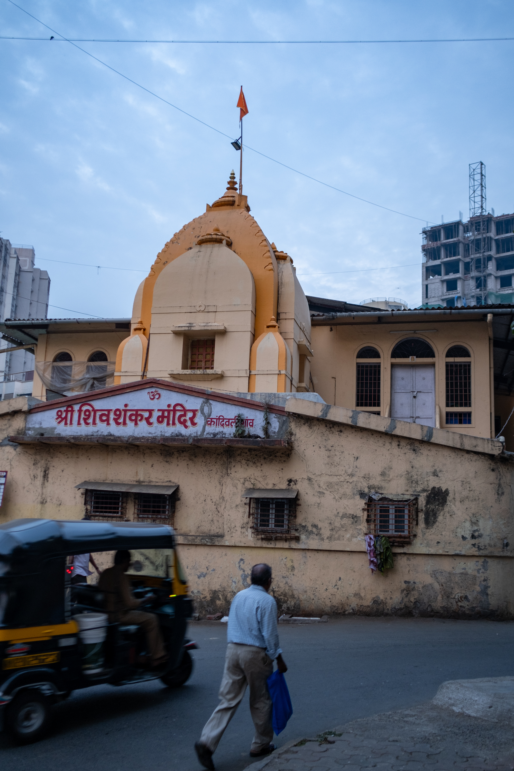 The wall of Shri Shiv Shankar Mandir wall bears the old name Kandivligaon, written in Devanagari script. The architecture of the temple is an eclectic mix. The temple’s north Indian-style shikhara (spire) appears to be a modern addition, rising incongruously over the sloped roof superstructure typical of Konkani vernacular architecture.