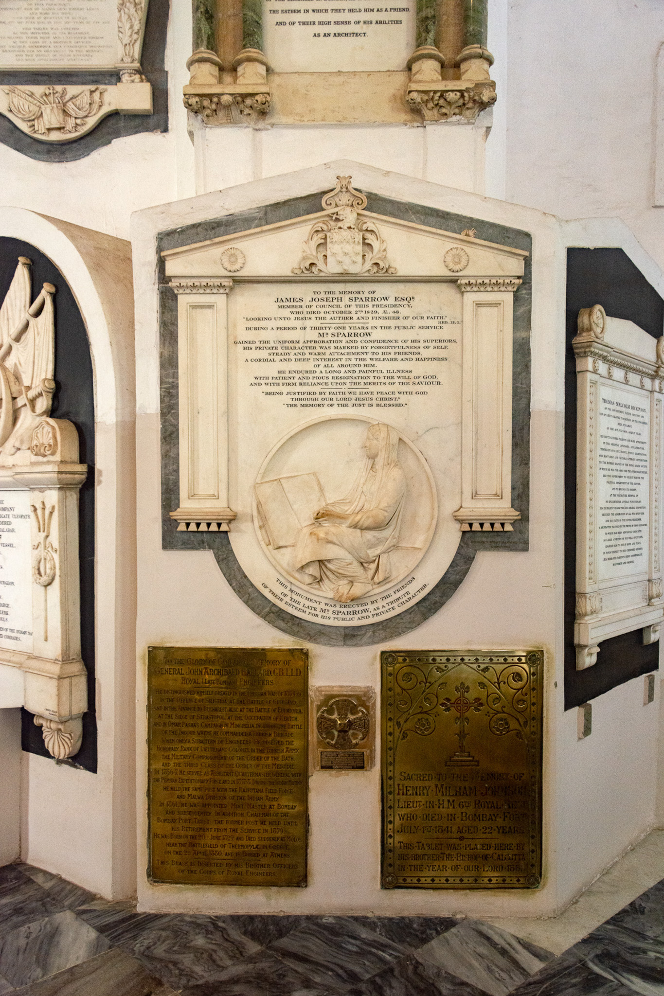 Dated from around 850 CE, a Saxon-era brooch was discovered in 1867 during excavations at St. Georges Street, Canterbury. Cast in bronze with complex decorations, the design was replicated for a stone cross erected at Canterbury Cathedral. Similar replicas, mounted on fragments of stone from Canterbury Cathedral, are placed in Anglican Cathedrals worldwide. The cross sent to the Diocese of Bombay is embedded in the west wall of St. Thomas Cathedral (at the bottom, between the two plaques as seen in the above figure).