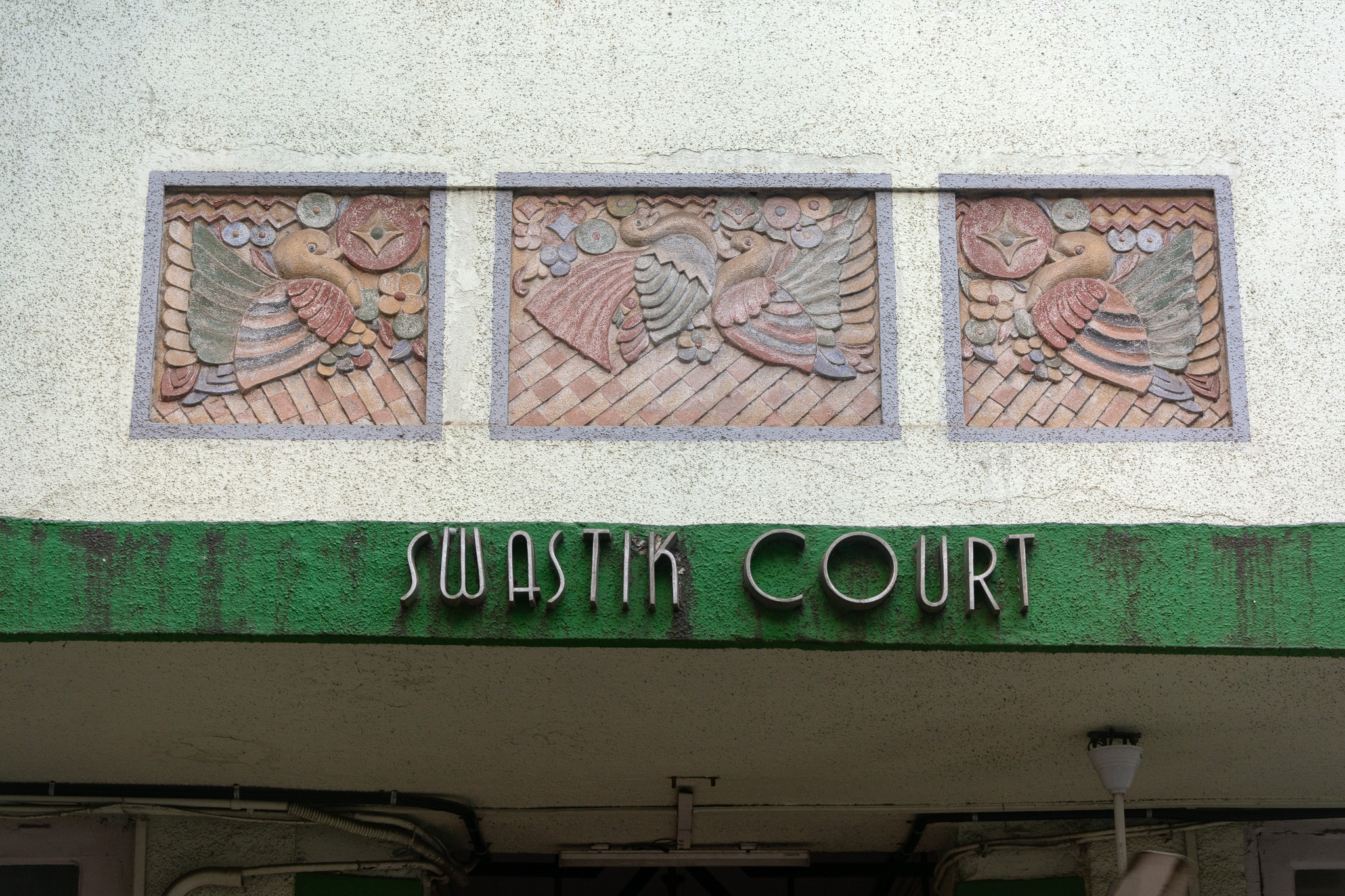Bas relief panels exhibit tropical fauna, Swastik Court. The three-panel design on the front façade was originally made from colourcrete but had been plastered over during previous interventions. They were revealed during the latest restoration of the building.