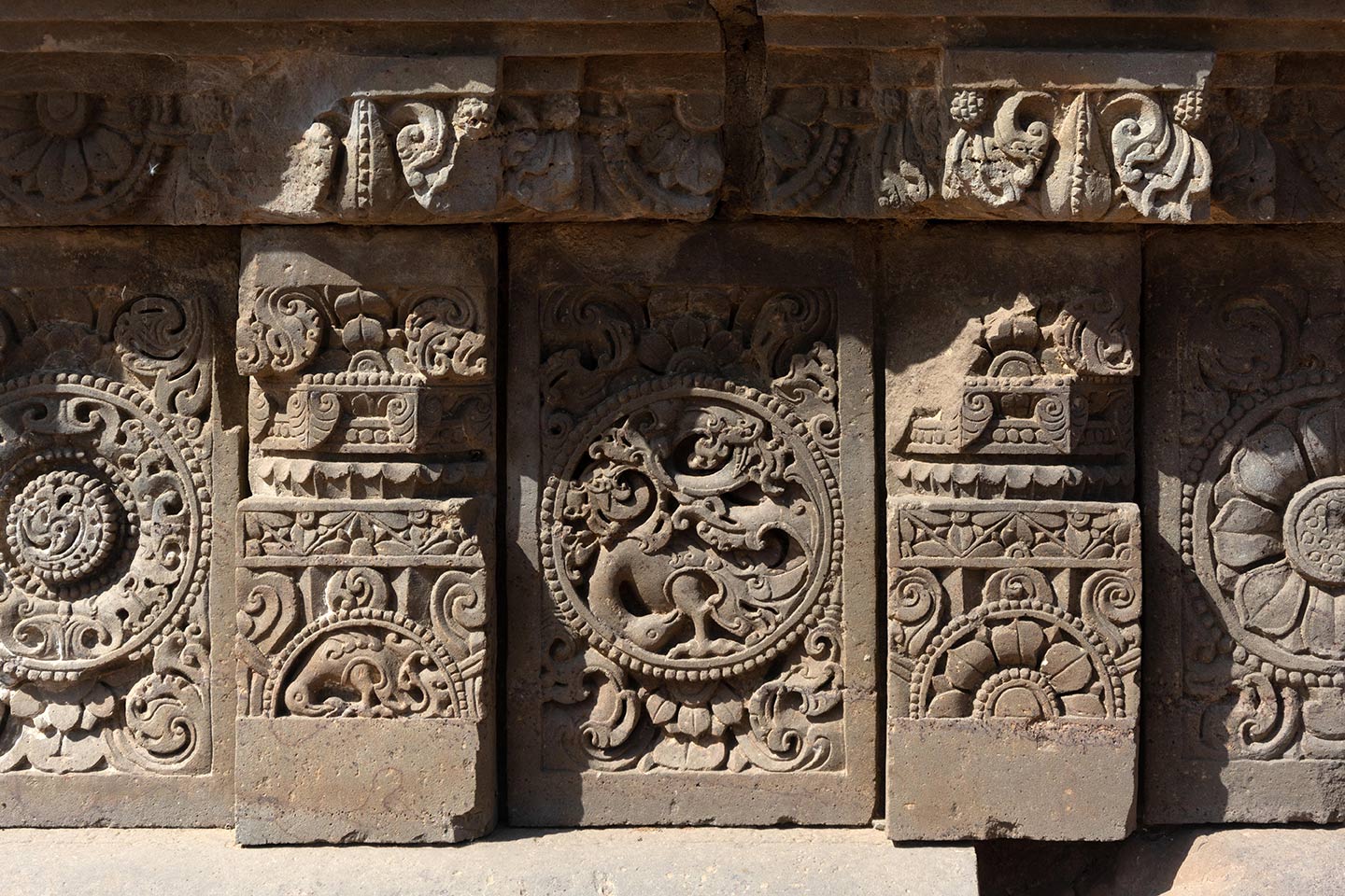 Tablet-like plaques are placed on the adhisthana (facing east). These plaques depict various types of flora and fauna as well as hybrid creatures like kinnara, vyala, and makara. The plaques are tightly arranged, richly detailed, and deeply carved, creating contrasting shadows that make the artwork look three-dimensional in sunlight. The central artwork of the plaque is in the form of a circular medallion surrounded by a foliage motif. In this medallion, a bird (likely a peacock) with its head bent downwards is integrated with a creeper motif. The plaques are separated by squat pillars which have a square base, an octagonal shaft, and a square capital. The pillars are decorated with ardha padma (half lotus) and kalpa lata (creeper) motifs.