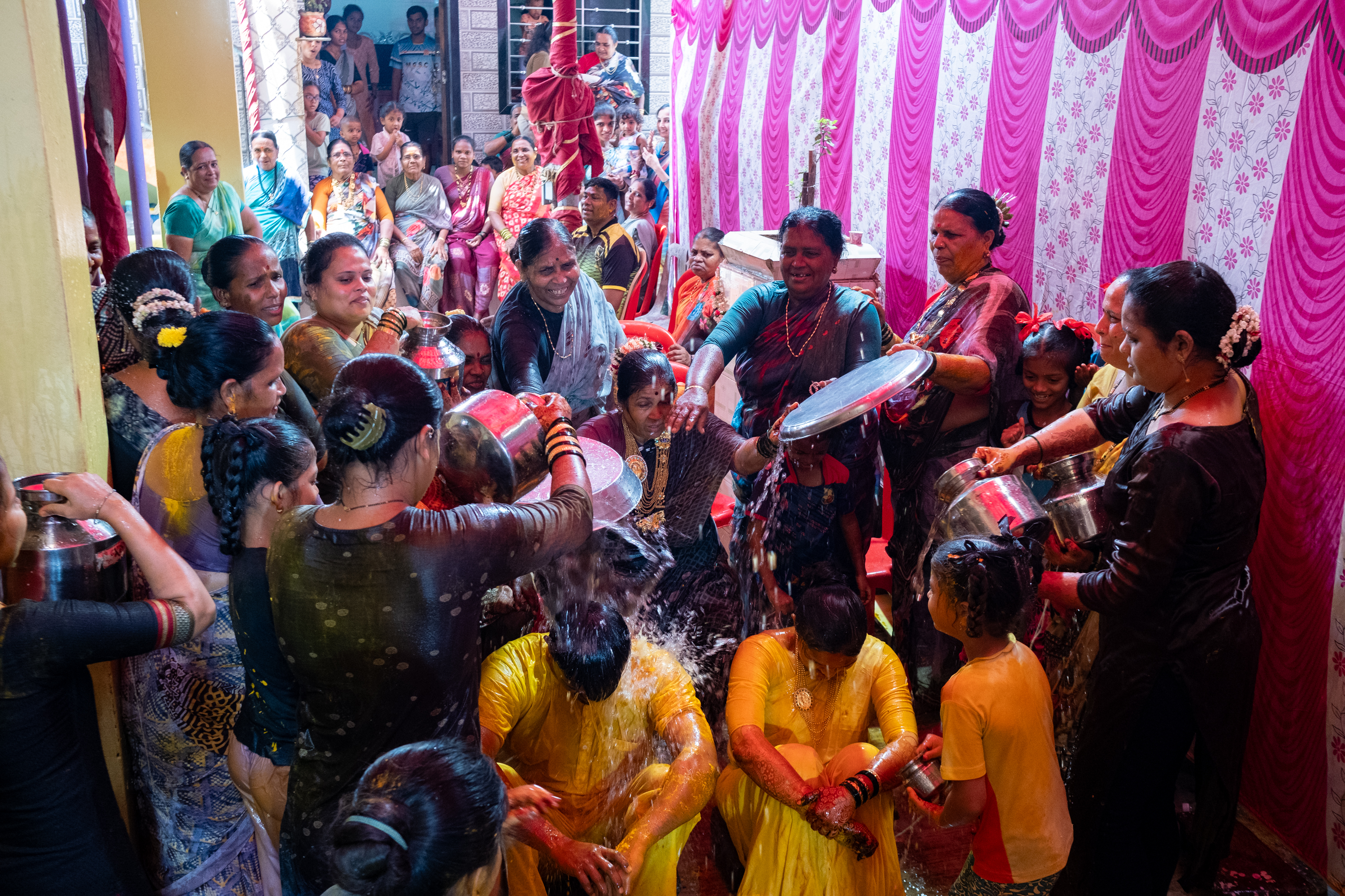 After the conclusion of the haldi (turmeric) ceremony, the bride and groom are washed with water. Earlier in the day, women in the family collect water from a well in several pots. Before using it for this purpose, the water is consecrated through prayers and rituals.
