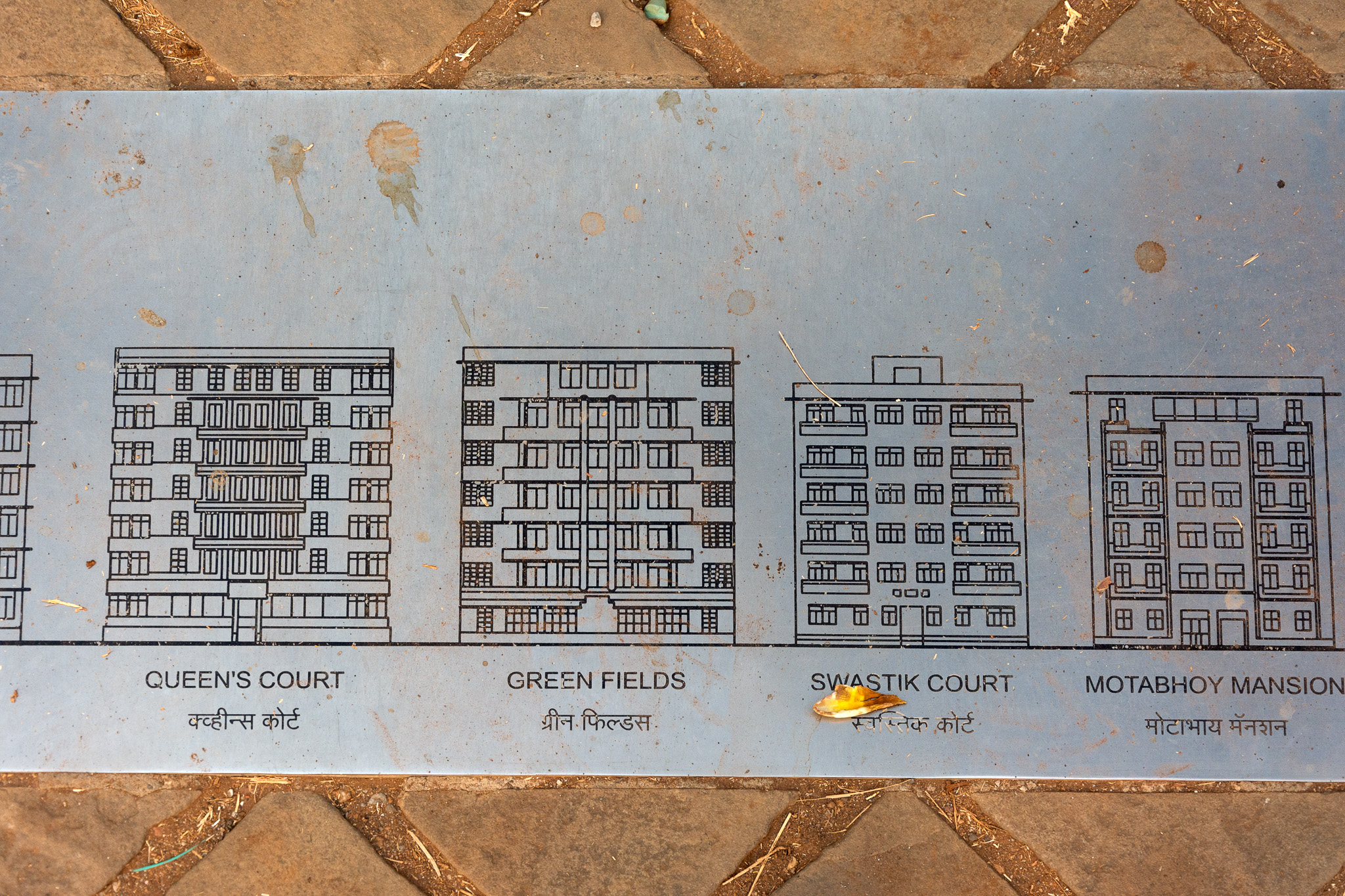 Elevation drawings of Art Deco buildings along Maharshi Karve Road. Seen here are Queen's Court, Green Fields, Swastik Court, and Motabhoy Mansion. These were all built in the 1930s decade, during a flurry of building activity on land reclaimed from the Arabian Sea as part of the Back Bay Land Reclamation Scheme, which started in 1928.