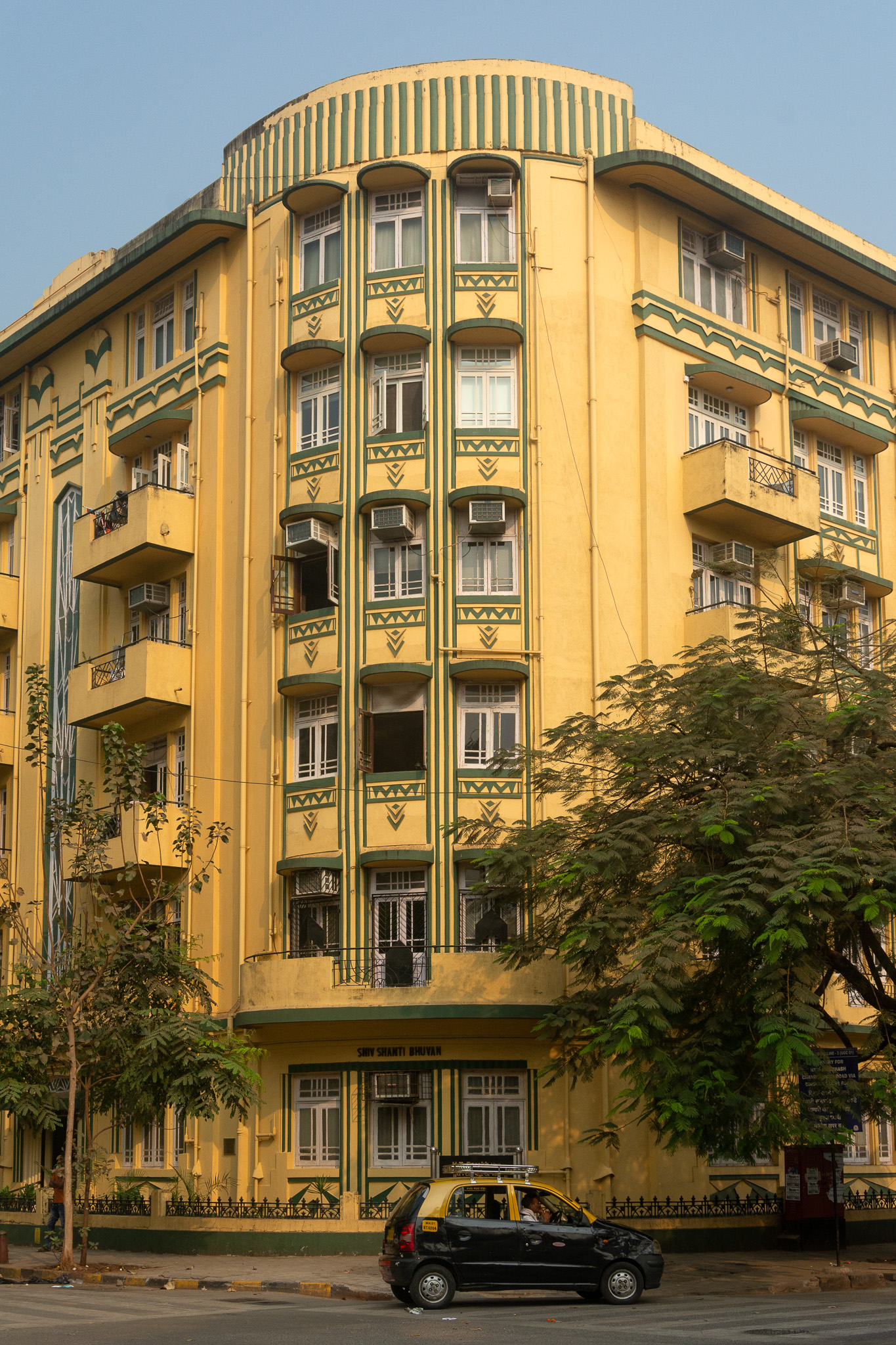 Three semicircular eyebrows (a horizontal ledge extending outward above a window) emphasize the faceted corner at the intersection of Maharshi Karve Road and HT Parekh Marg, Shiv Shanti Bhuvan.