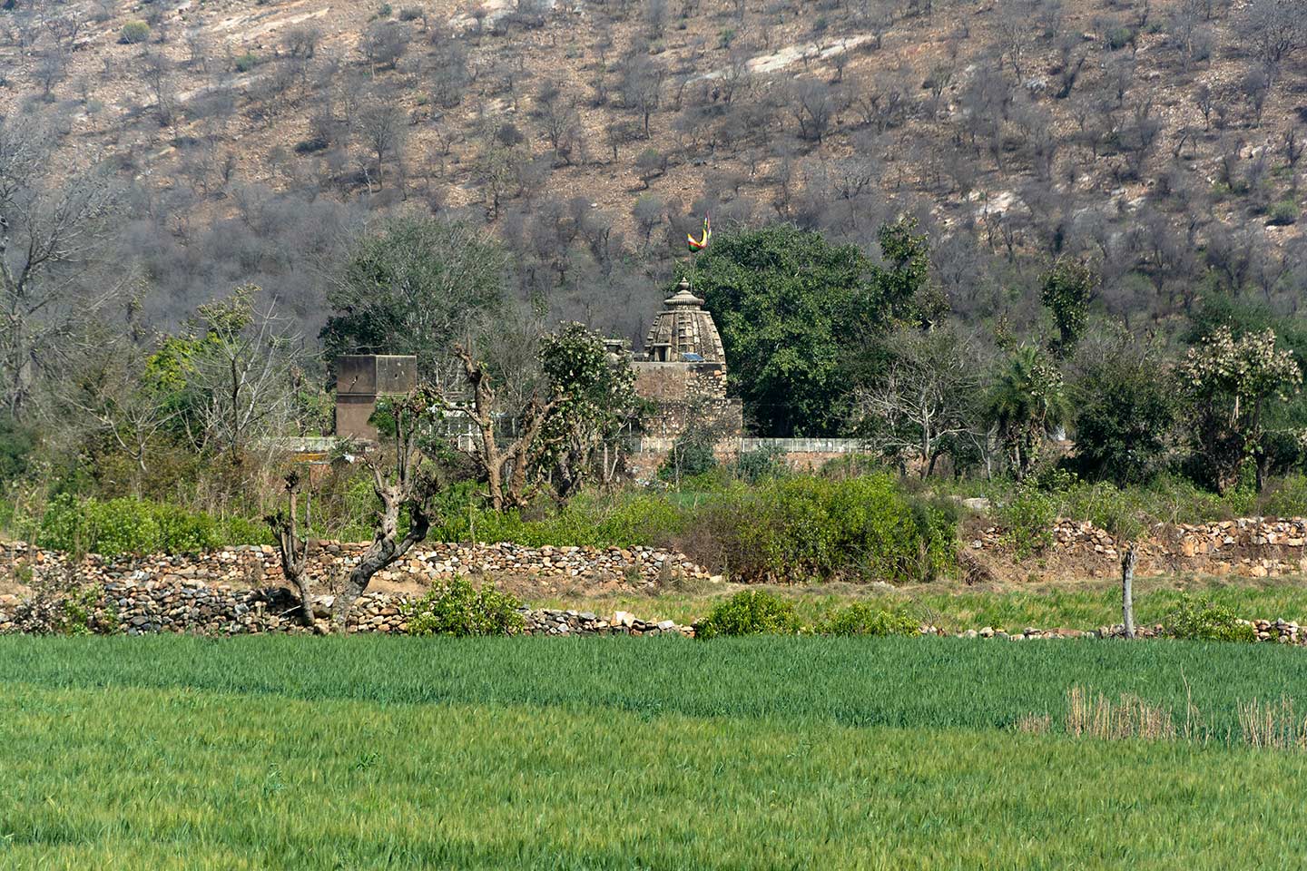 The Neelkanth Mahadev Temple is situated amidst dense vegetation, among the foothills of the Aravalli Range, inside the Sariska Tiger Reserve. The temple built in sandstone stands out in the greenery spread across the plains.