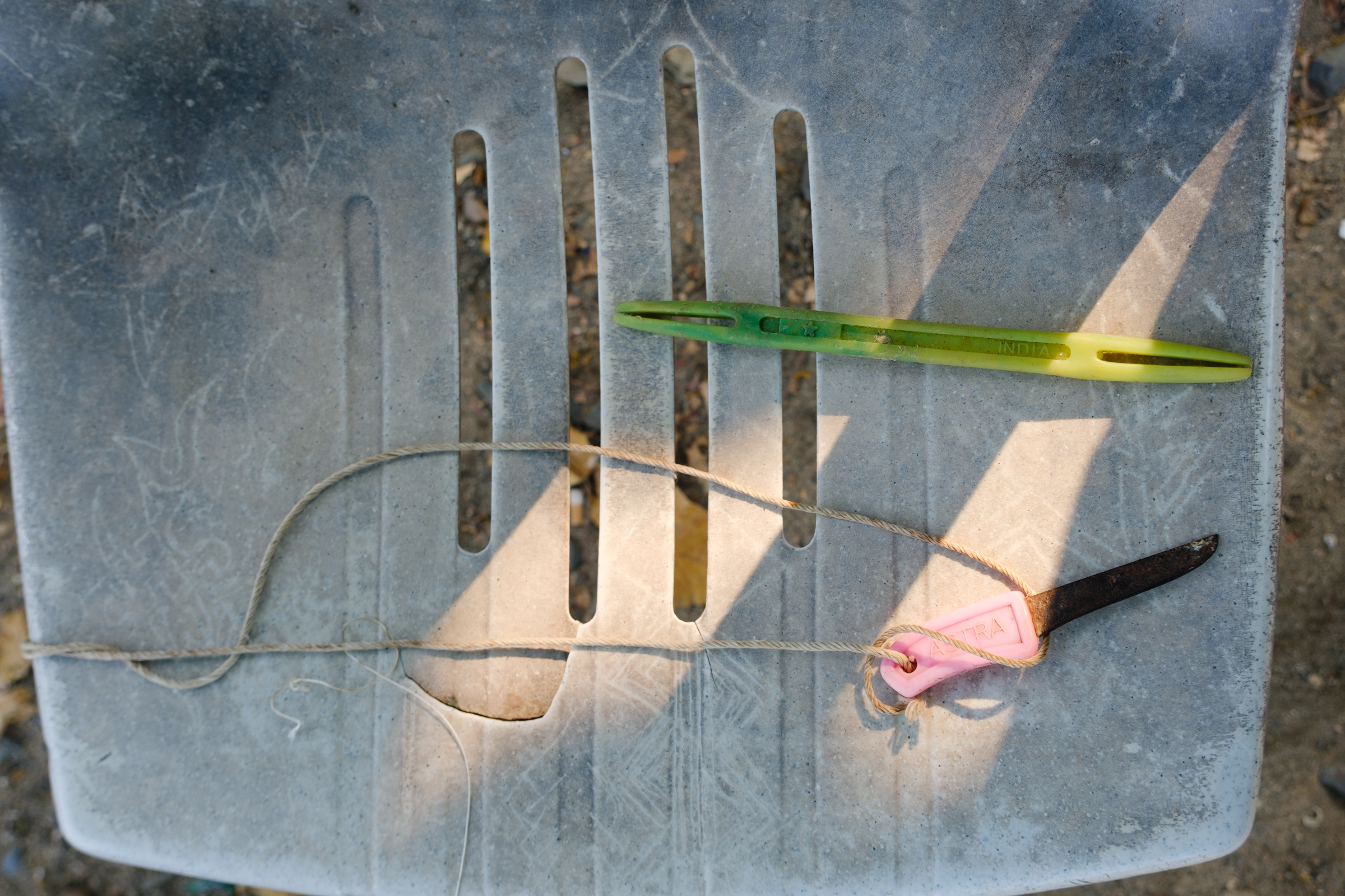 Net repair is done entirely manually, using simple tools like tasari and kathli. Tasari is a mending needle made of plastic, usually six inches long, around which the twine is wrapped. Kathli is a small knife used to cut the twine.