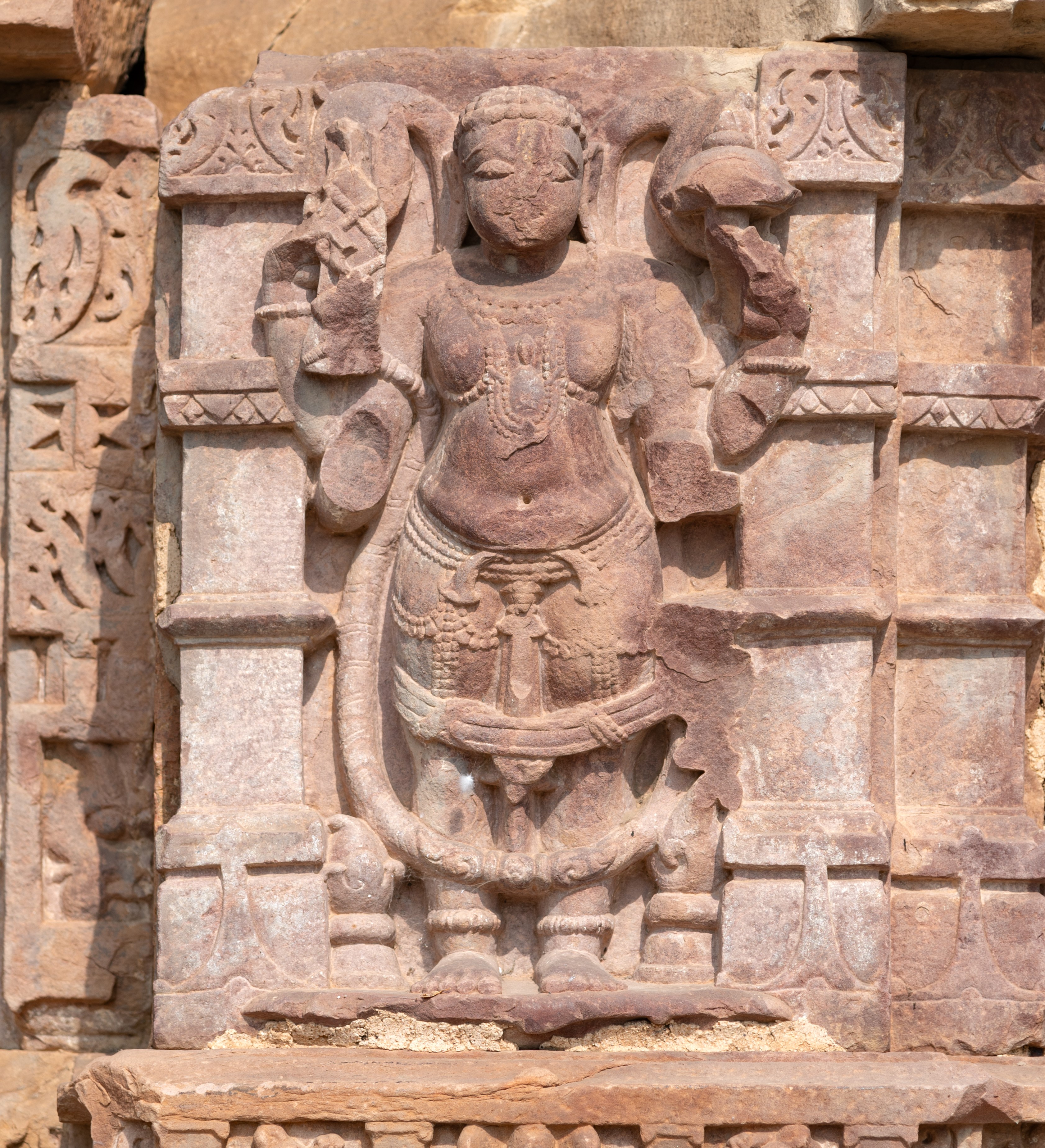 On the kakshasana (seat backs), the depiction of Vamana, an avatar of Vishnu, stands prominently. Vamana is portrayed with four arms, although two are damaged. In his upper right hand, he holds a pustaka (book). This attribute holds significant symbolism, as Vishnu in his Vamana avatar assumes the form of a Brahmin, embodying the essence of divine wisdom contained within the Vedas.