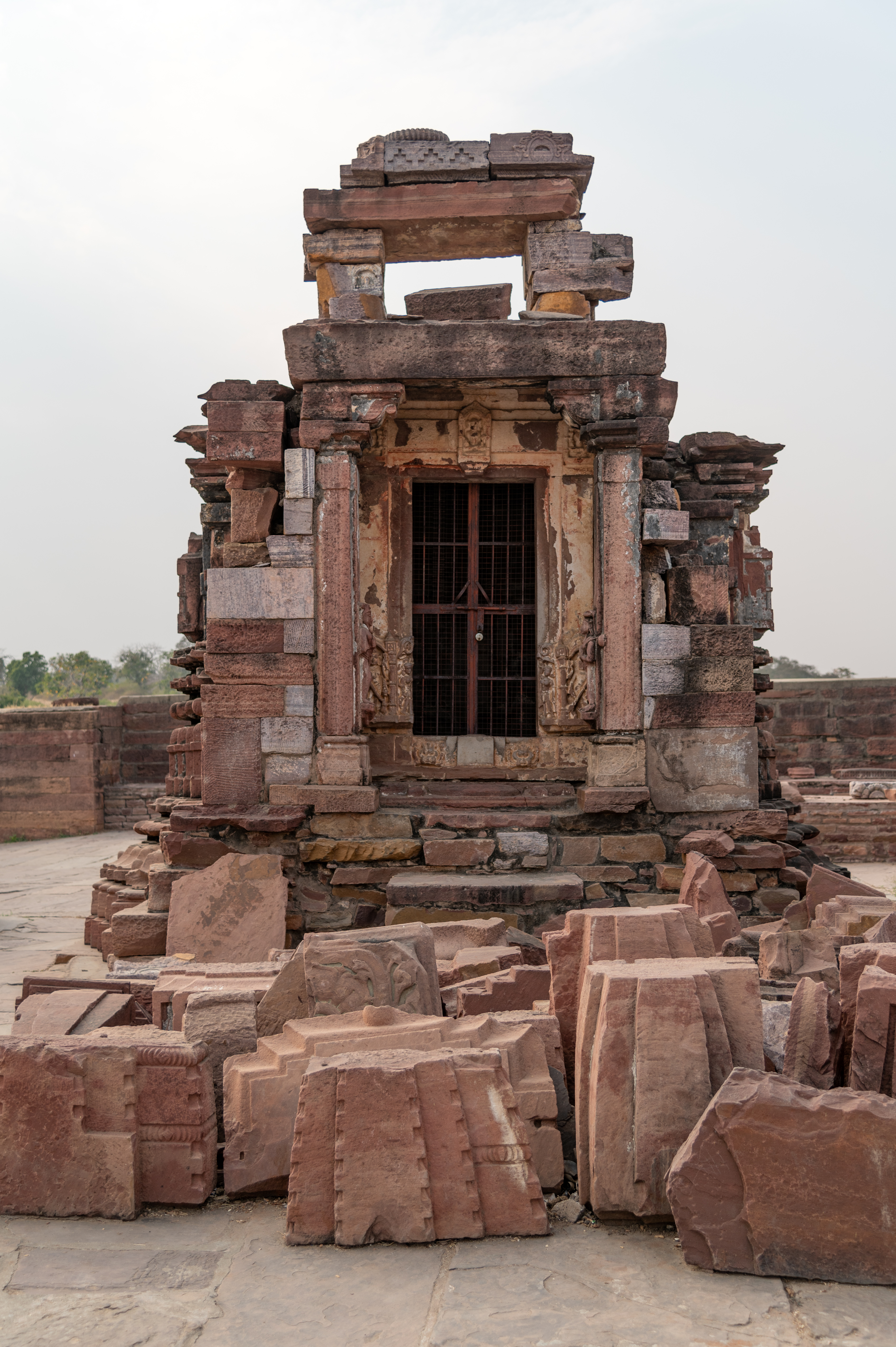 This is the front elevation of the temple with the shekhari shikhara in the Mahanaleshwar temple complex. The temple is in ruinous condition. Seen here are the architectural fragments of the temple which are lying in the vicinity of the temple. The mandapa (pillared hall) of the temple has fallen leaving behind only the outer stone frame.