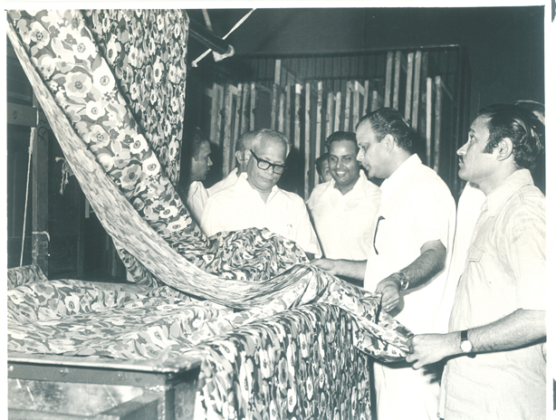 Shri Dhirubhai Ambani is showing the exporters the Naroda Mill's fabric printing machinery imported from Switzerland. Image Courtesy: Reliance Industries Limited.