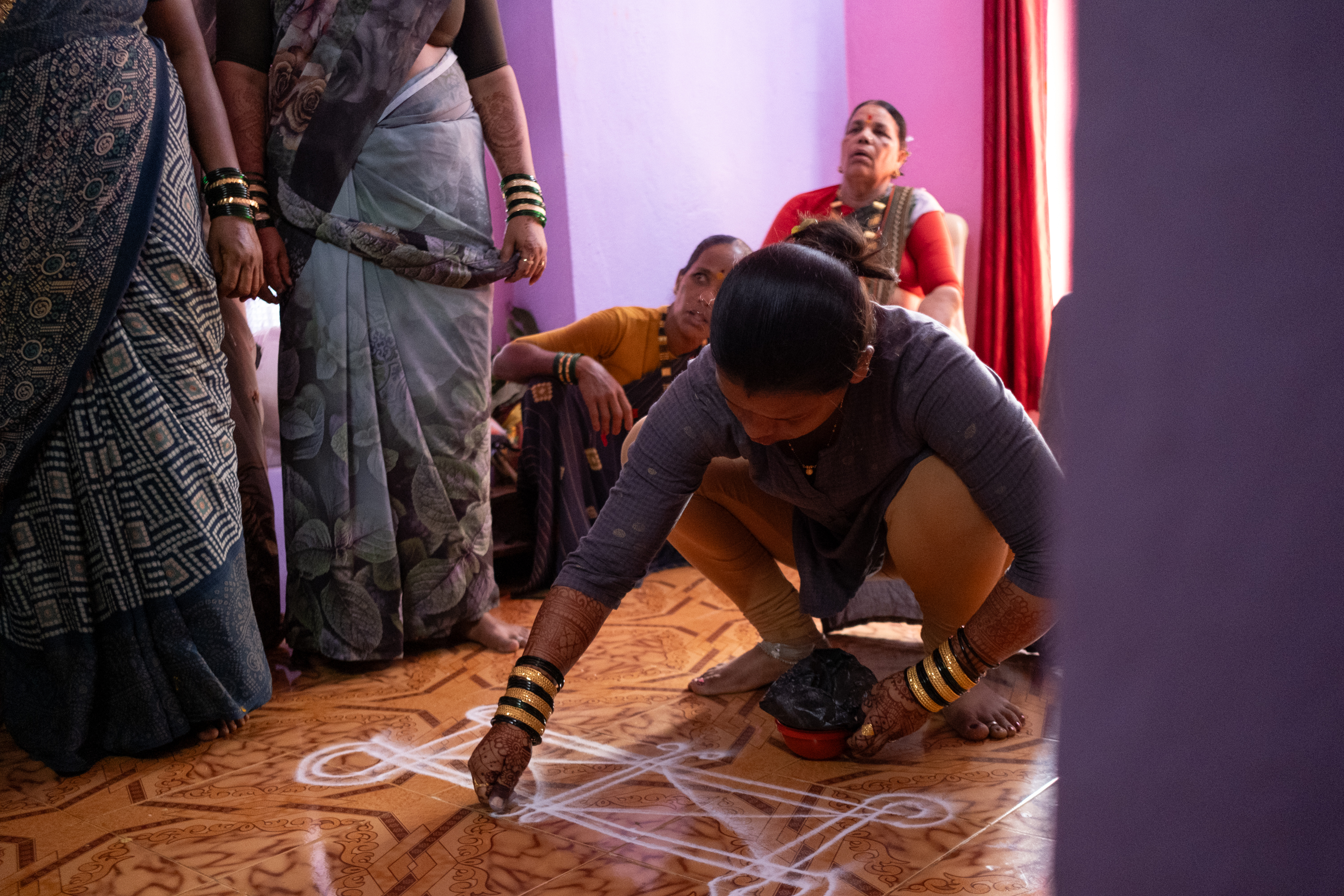The venue for the haldi (turmeric) ceremony is decorated with rangoli patterns drawn on the floor using white chalk powder or rice flour.