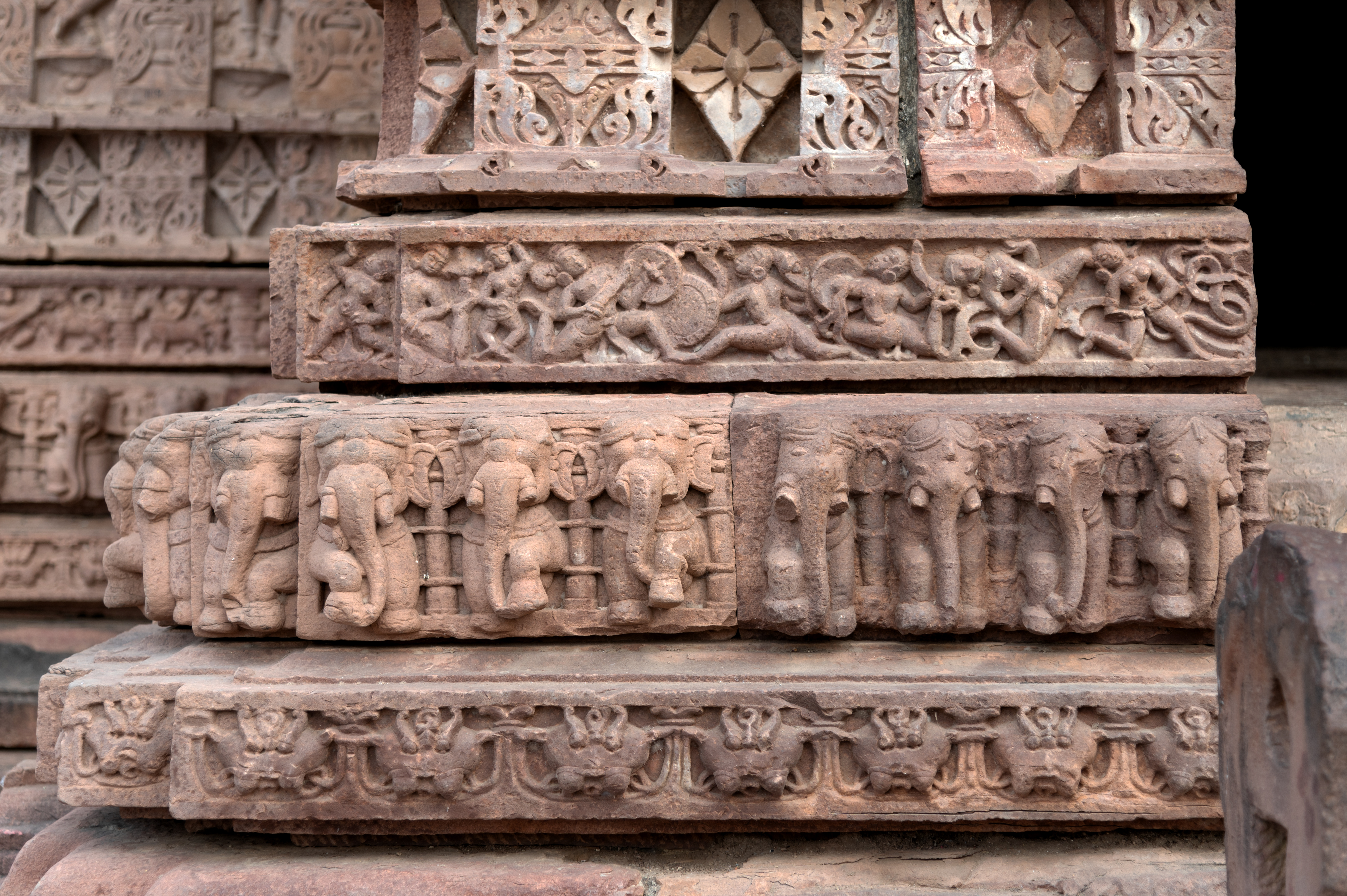 Seen here are the plinth details of the east-facing elevation of the Mahanaleshwar Temple. Starting from the bottom to top, there are four mouldings in the plinth which consist of a plain kani moulding, graaspatti (a band of kirtimukha or face of glory), gajathara (band of elephants) and narathara (moulding containing human figures). The narathara has mithuna (amorous couples), maithuna, and deities in the depictions.