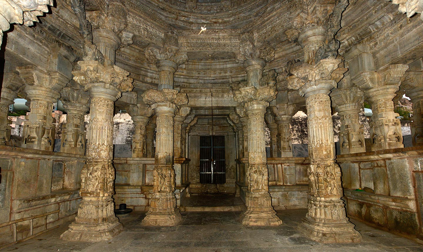 The ceiling of the mahamandapa (pillared hall) rests on eight elaborately carved tall pillars. Each pillar has a square base, transitioning into a shaft that changes from square to octagonal in the middle and finally becomes circular at the top. Above these are architectural moldings, a shaft that supports the capital, and carved bharvahakas (mythical flying load-bearing figures). Notably, the square portion of the shaft of each pillar in the mahamandapa is carved with a niche on each of its four faces. Within these niches are sculptures portraying various figures, including apsaras (celestial damsels), yogis (ascetic), or royal figures in acts of veneration and in one case, a four-armed Bhairav.