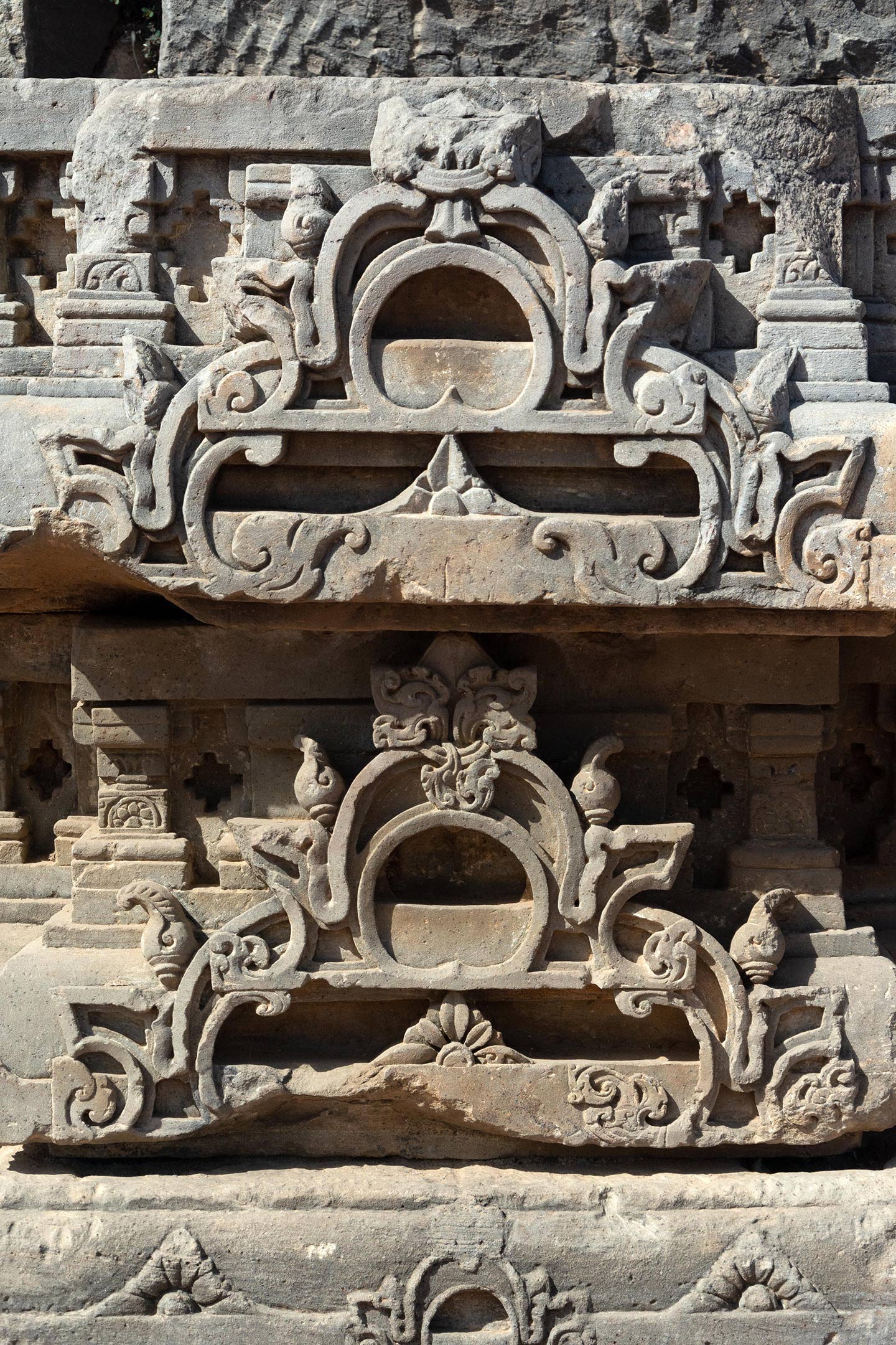 Broken debris from the original temple assembled on the northeast face of the adhisthana. Seen in the carvings are the split gavaksha motifs.