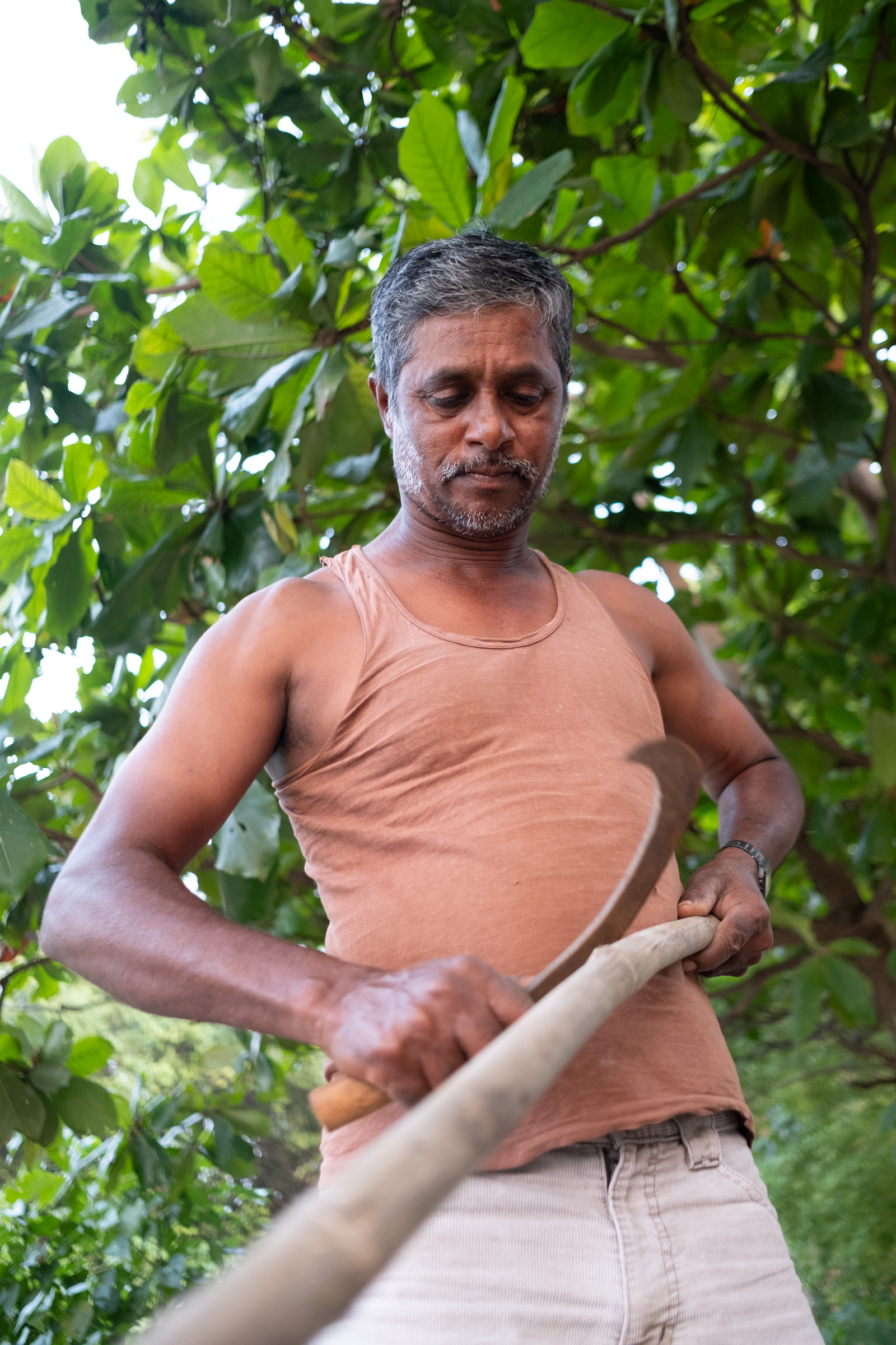 After a brief stint at home, Rakesh and Rahul Bhalia return to the coast to prepare for the next fishing expedition. They meticulously clean the boat, removing debris to ensure a clean working space. They inspect and repair fishing nets, lines, and other equipment to ensure they are undamaged. In the photo, Rakesh is seen crafting a new oar to replace the worn-out one.