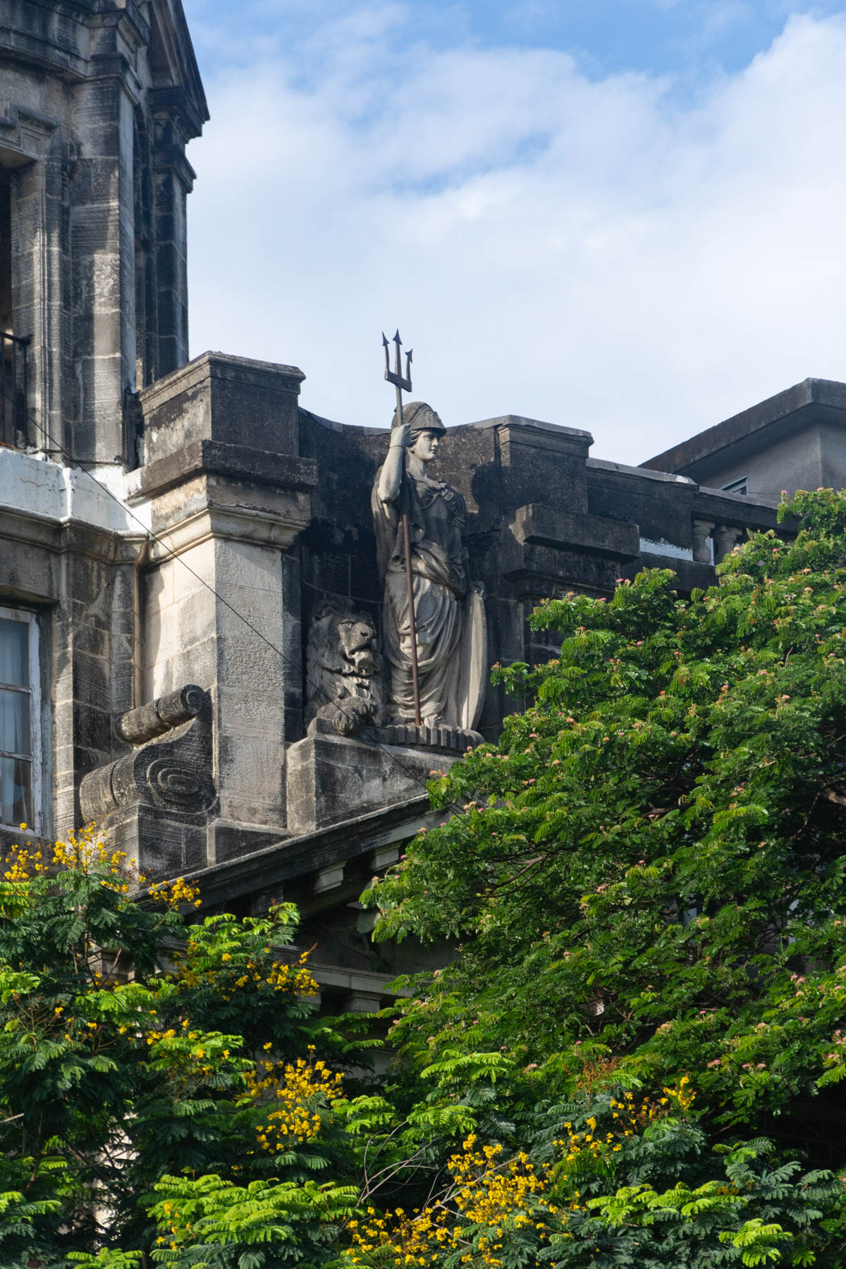 Two statues of Britannia stand aloft on either side of the Marshall Sons and Co. building, one facing Shoorji Vallabhdas Road and the other Shahid Bhagat Singh Marg. Britannia holds a trident (symbol of maritime supremacy) and a shield. She is wearing a Corinthian helmet, and seated at her feet is the British Lion. Britannia is a personification of Great Britain, a symbolic figure that first emerged during the Roman occupation of Britain.