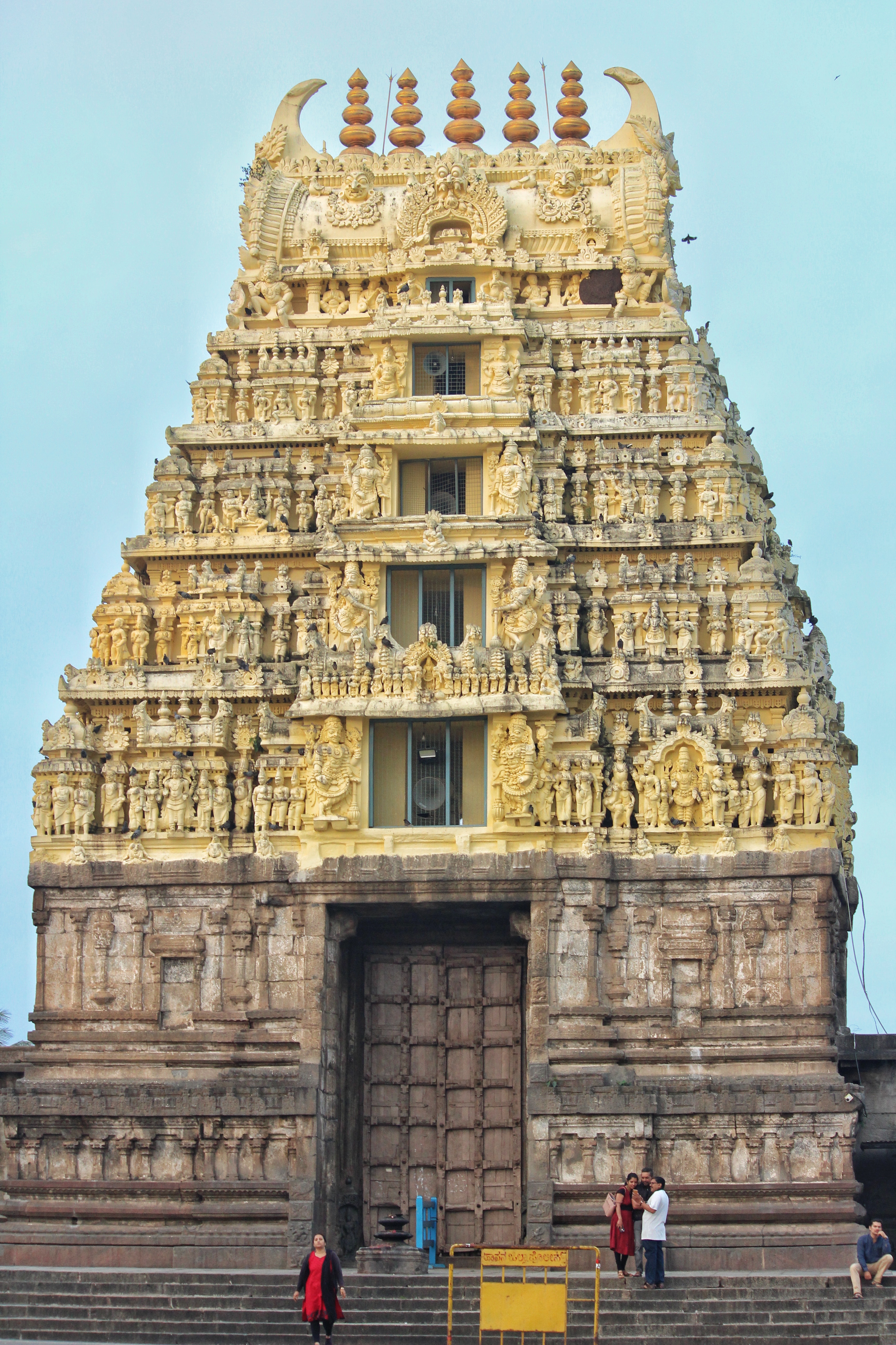 A Gopura is an entryway that stands tall at all southern Indian temples. These are tapering structures are usually ornate and multi-storied. One enters a temple or a temple complex through a Gopura. This golden-hued Gopura at the Chennakeshava temple is in the middle of a boundary wall that surrounds the temple. According to inscriptions, the original structure built by the Hoysala King Vishnuvardhana was demolished in an attack by the Delhi Sultanate. This seven-storied Gopura that stands on firm granite pillars was later rebuilt by the Vijaynagar King Harihara II in the year 1397. The inscriptions sing praises of King Harihara who not only rebuilt the Gopura, but also reinstated the temple grants and 67 services to Lord Keshava started by King Vishnuvardhana.