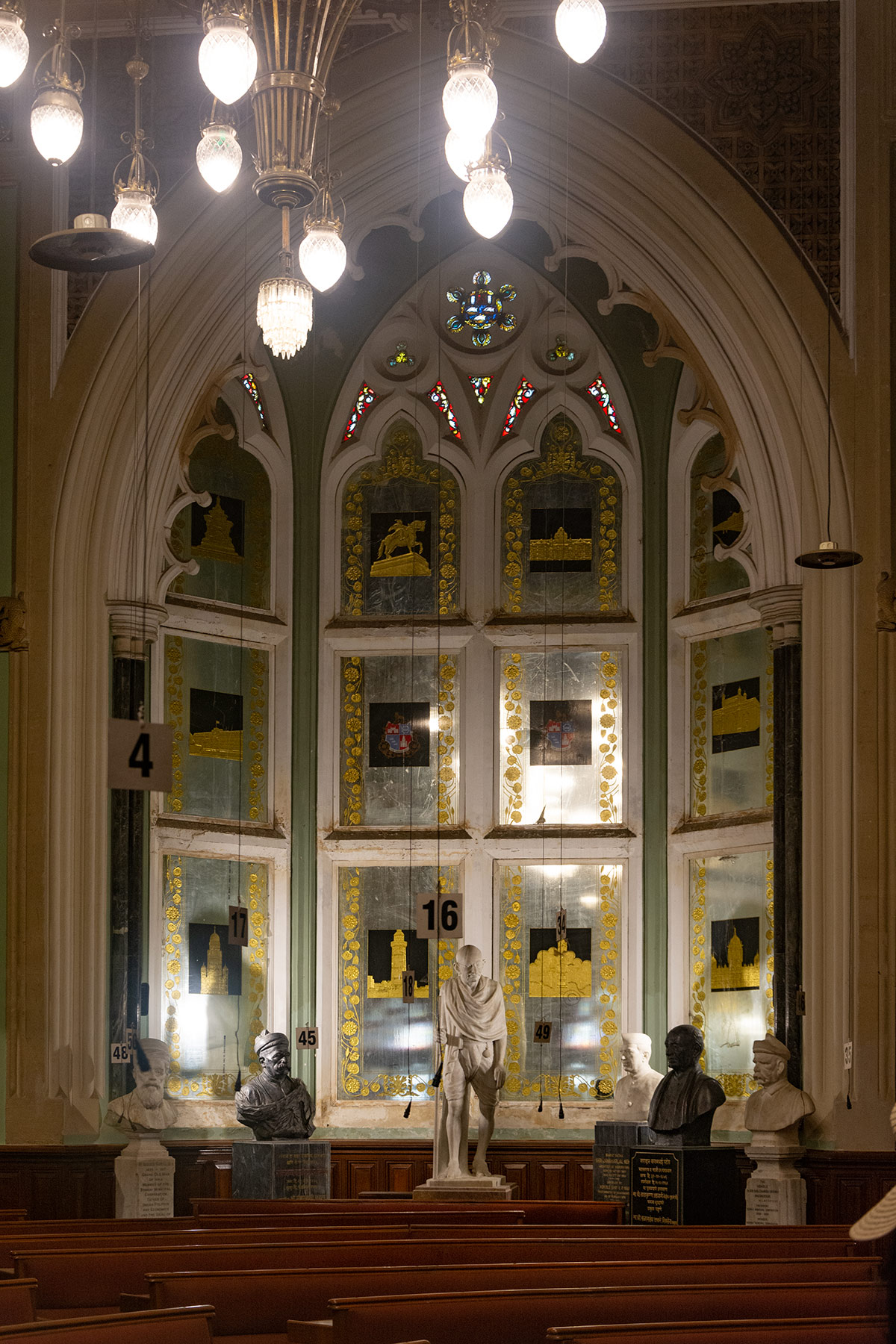 Frederick W. Stevens had originally designed a full-height bay window decorated with stained glass at one end of the Corporation Hall. Light entering through this window naturally illuminated the hall. In front of this bay window was a raised platform used by speakers. This arrangement was later changed, with the raised platform now moved to the side.