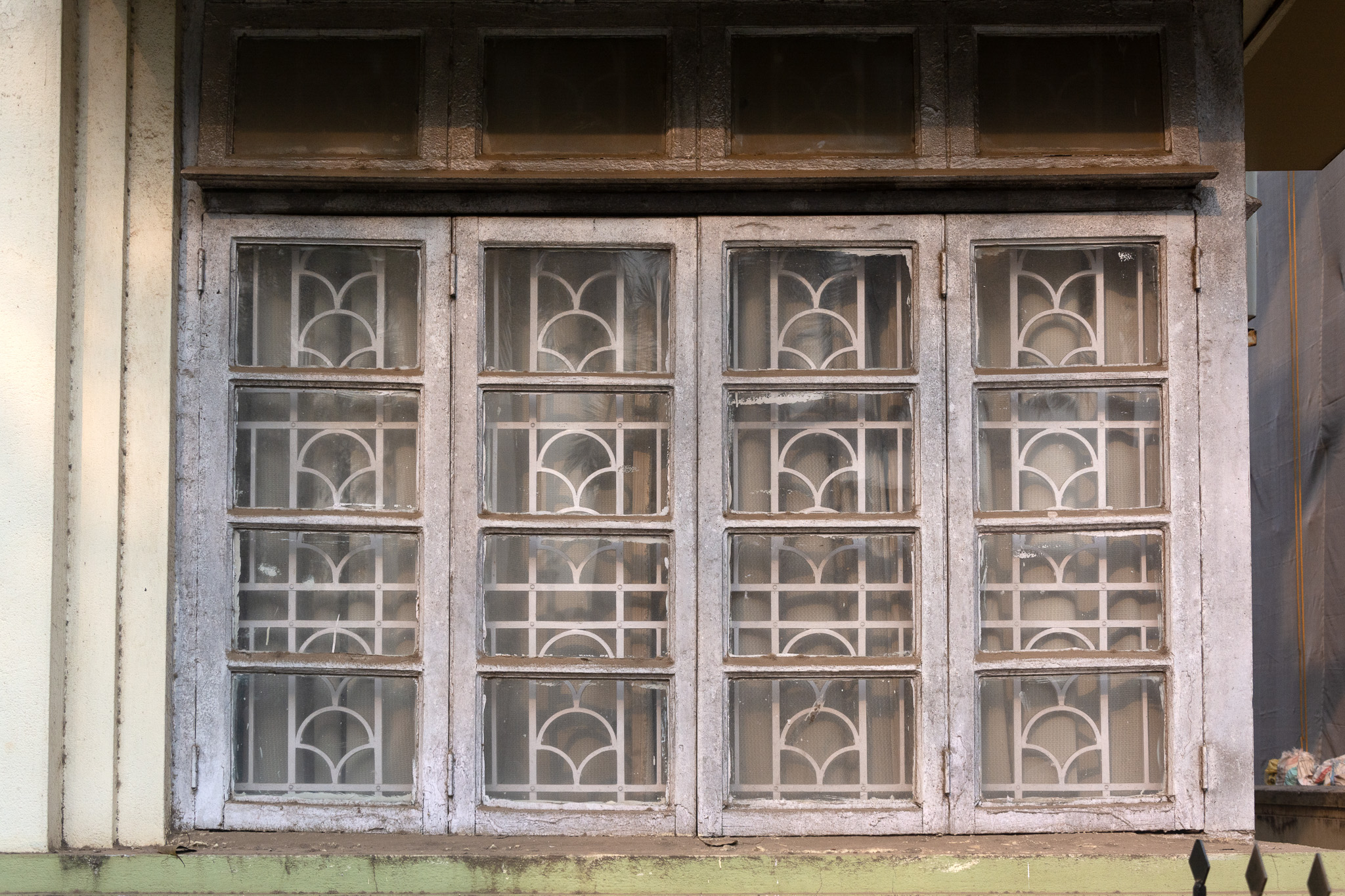 Frozen fountain motif on window grille, Queen's Court