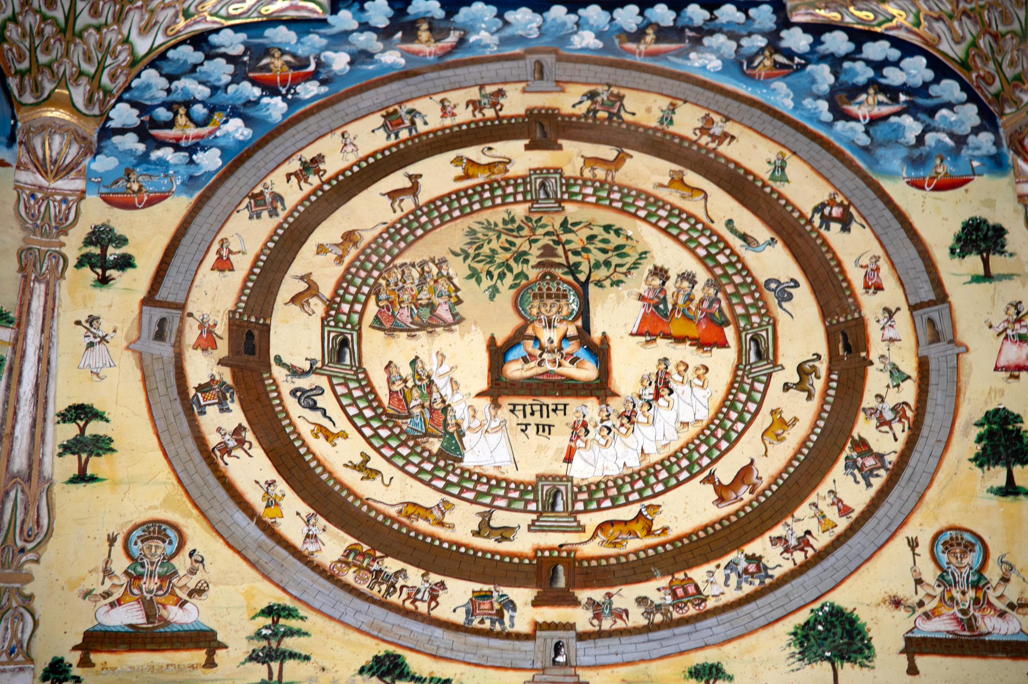 A painitng of Samavasarana on the ceiling of the mandapa (pillared hall) of the Bhandasar Temple. Samavasarana is a divine preaching hall of the Jains which is designed in the form of four circular passages, each having four entrances. At the centre of the innermost circle sits the Tirthankara followed by other monks of the tradition, laypersons and ascetics. The circle next to this is populated with animals. The outermost circle depicts a procession of elephants. The size of the preaching hall depends upon the enthroned Tirthankara.