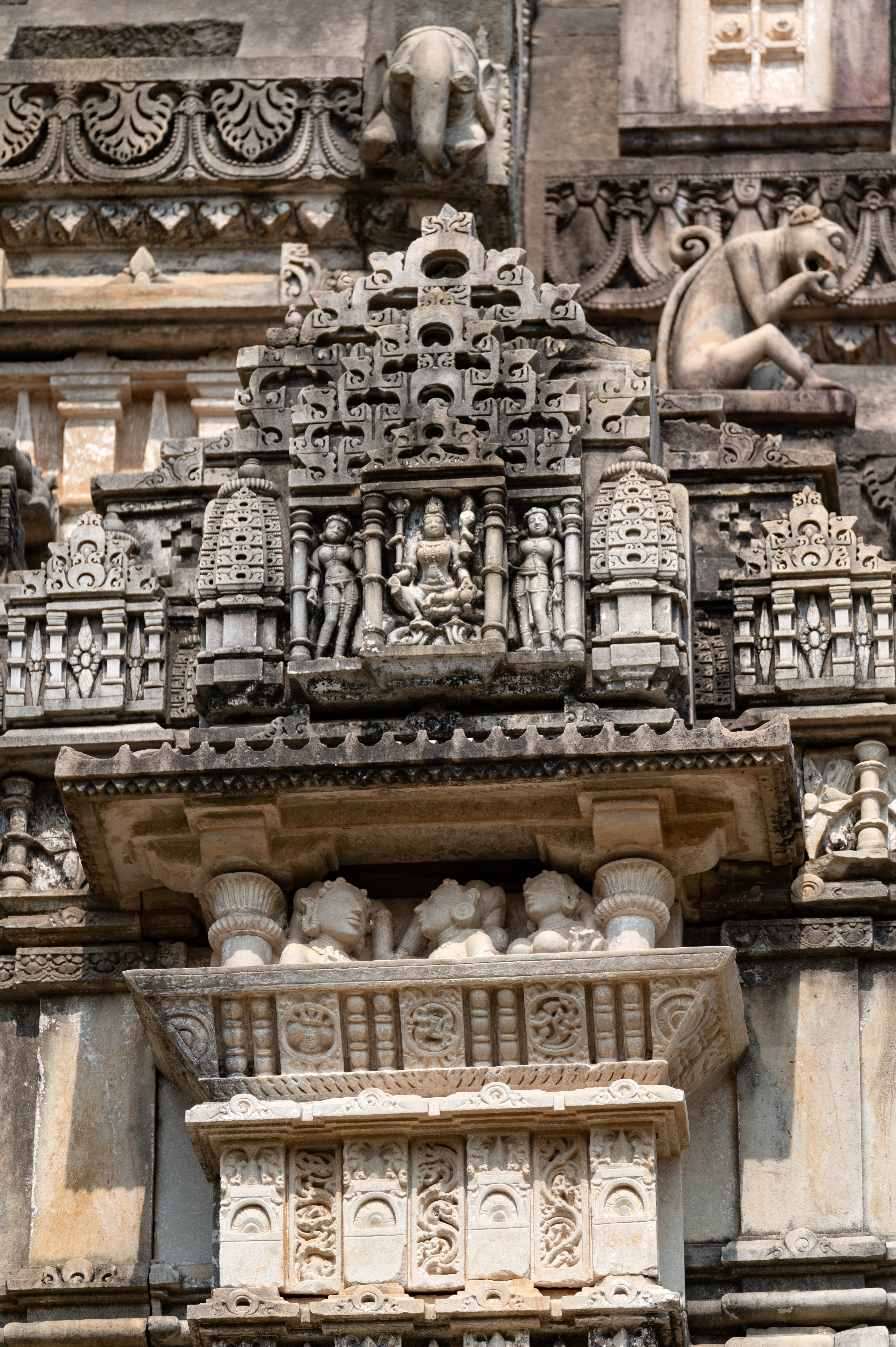 The southern side of the sukanasa (antefix above the roof of the kapila) is carved with a distinct scene depicting a miniature balcony where three beautiful women are shown conversing with each other. Above the balcony, an udgama (pediment of interconnected chaitya dormers) is placed, depicting a four-armed Goddess seated on a lotus seat, flanked by two attendants.
