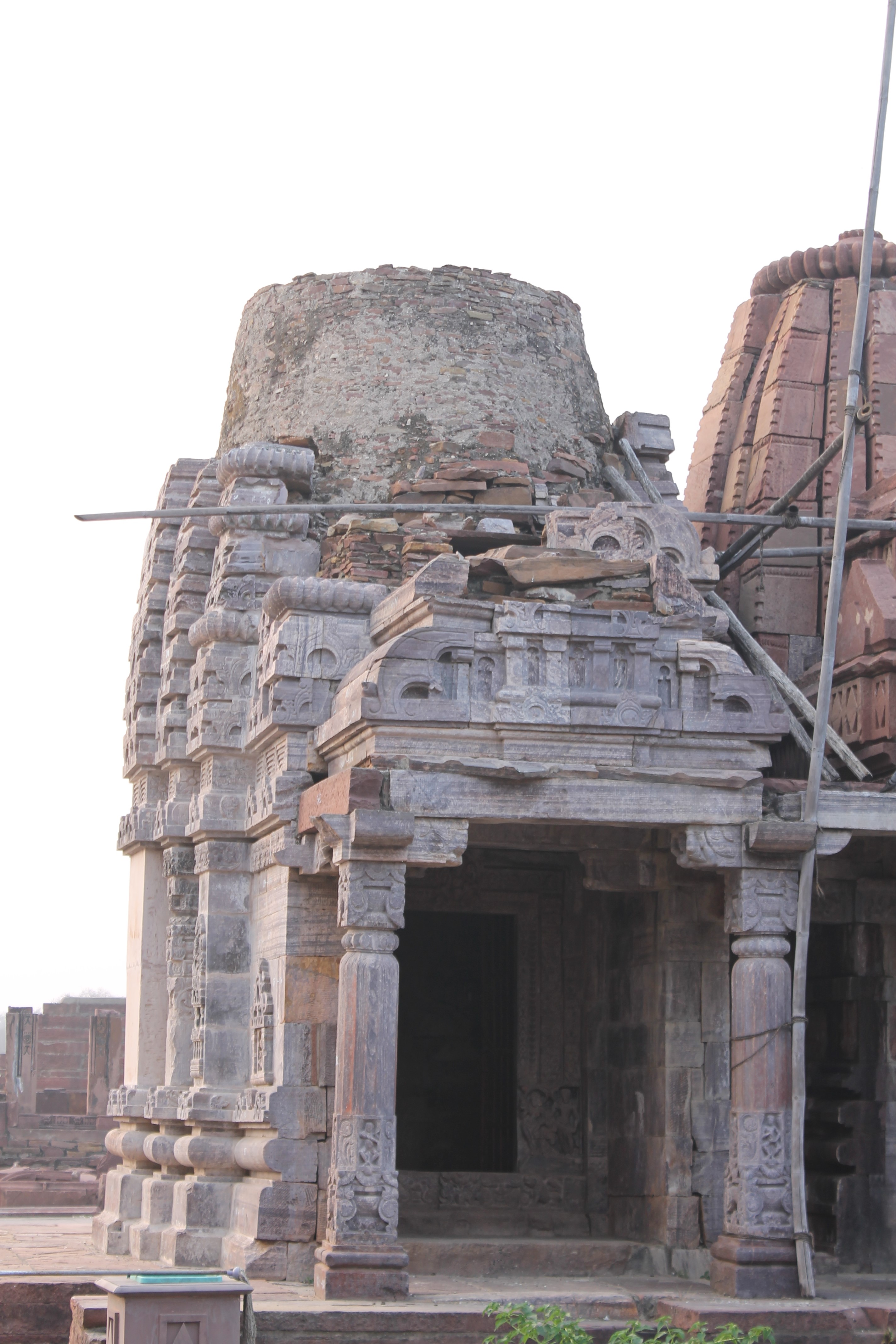 This is an east-facing view of the side shrine from the Triple-shrine Temple in the Mahanaleshwar temple complex. The core of the shikhara (superstructure) of the temple is composed of bricks.