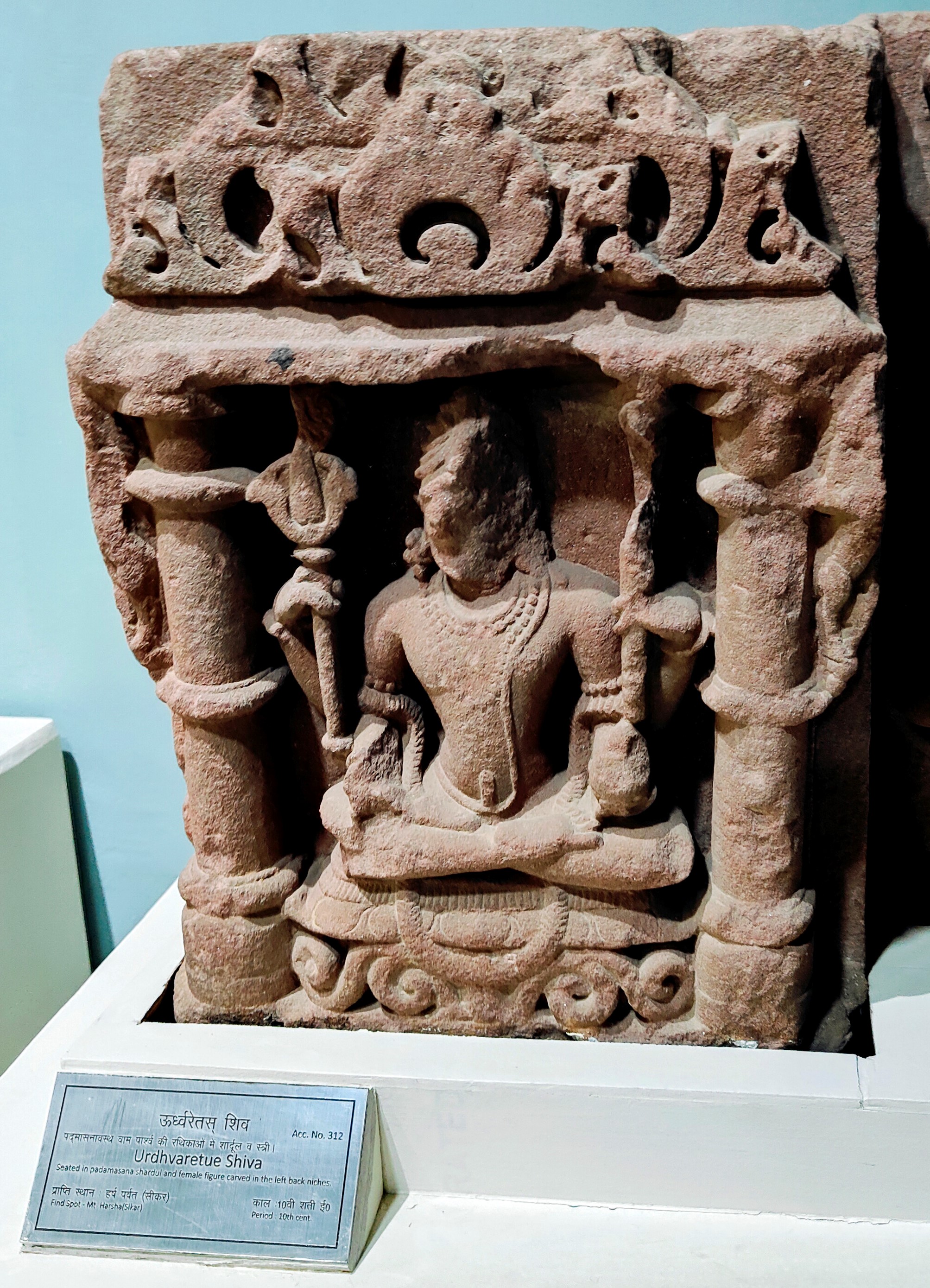 This Shaiva figure was possibly part of a devakostha or sculptural niche placed on the walls of a now-lost Shaiva shrine. It is now housed in the Government Museum, Sikar. The four-armed seated figure holds a trident and a staff in the upper two hands, while the lower two hands are considerably damaged. The figure is ithyphallic, symbolizing the Urdhvareta aspect of Shiva, indicating mastery over the vital energies through ascetic vigour. It is plausible that this image represents Lakulisha, the preceptor of the Pashupata tradition. Image courtesy: The Government Museum, Sikar