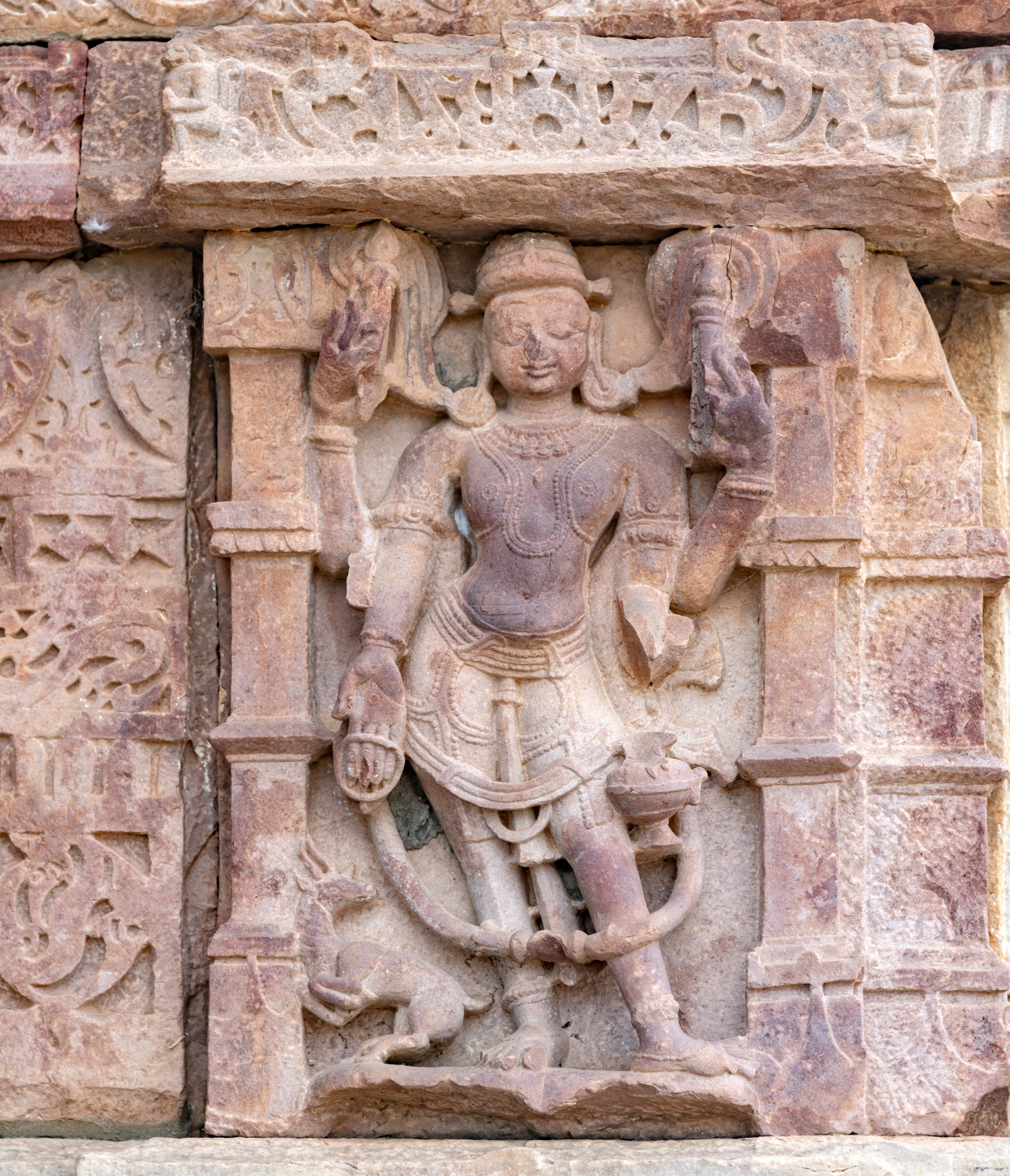 Vayu is depicted standing with a gentle smile. His four arms bear testament to his celestial nature. In his upper hands, he grasps a staff, symbolizing authority and guidance. His lower hands cradle a kamandalu (water pot) and extend in varadaksha (boon-giving gesture with a rosary). At the base, his vahana (mount), the antelope, is depicted in graceful motion, adding to the dynamic energy of the scene.