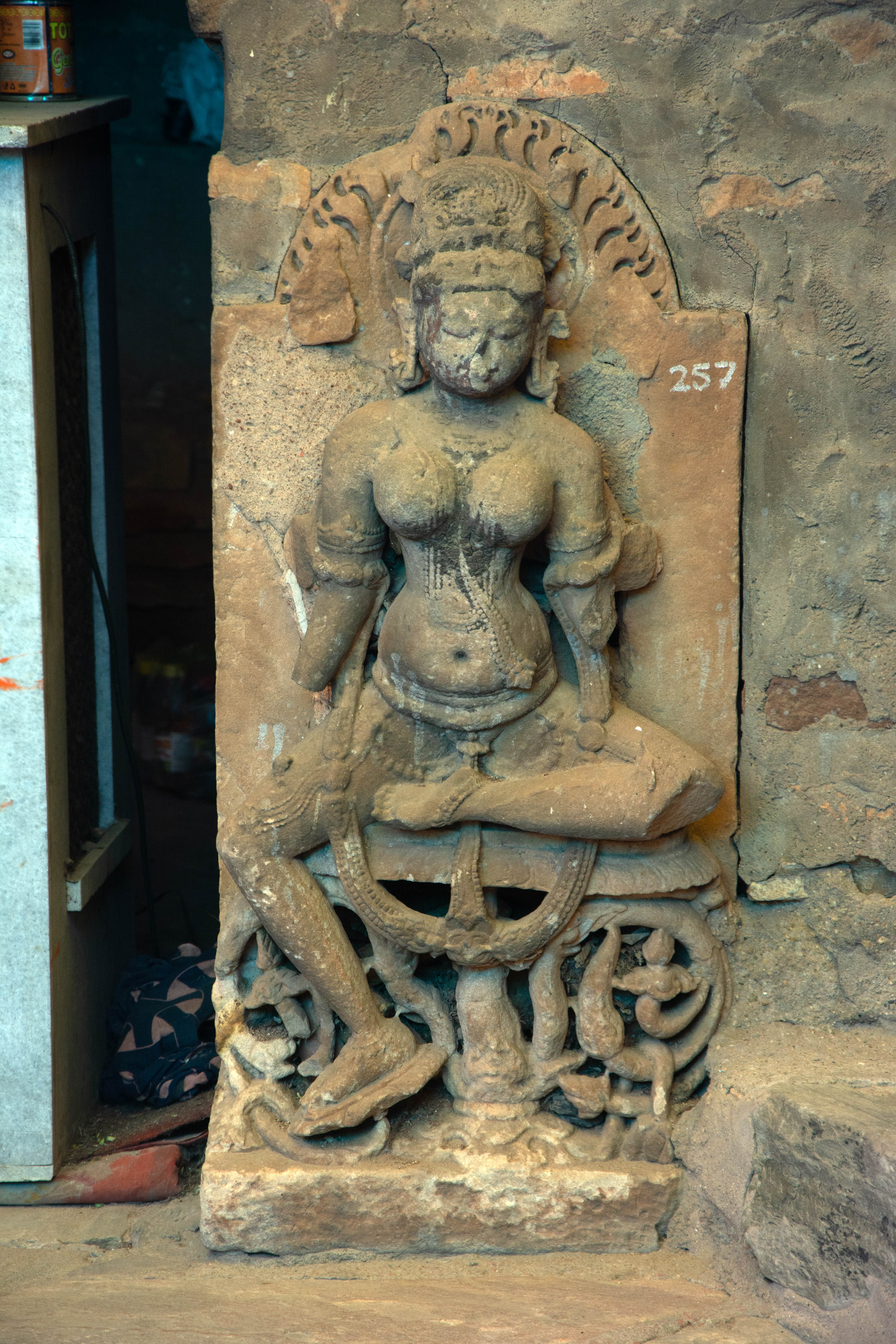 This is one of the many images of yoginis found at the site, hinting at a lost yogini temple compound. The placid expressions of this two-armed yogini seated in the lalitasana posture suggest her benevolent nature. Contextualizing this image with several other relevant images suggests a maturity of Shakti and tantric traditions at the site.