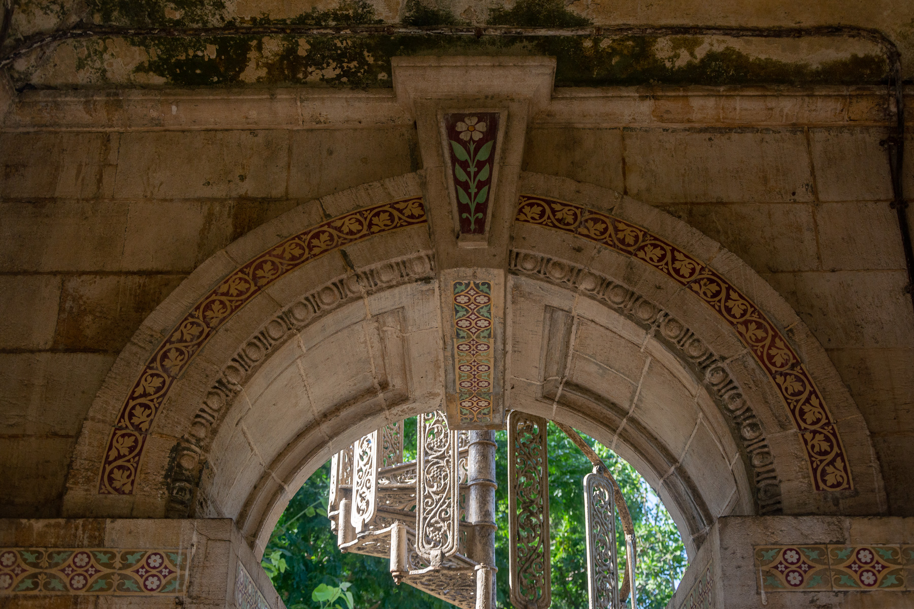 Detail of arch and keystone with panels of Minto tiles and dressings of Blashfield's terracotta from Stamford, Lincolnshire. The David Sassoon Clock Tower is built from Porbandar stone, which was used in many public buildings of Mumbai, including Chhatrapati Shivaji Maharaj Terminus, Knesset Eliyahoo Synagogue, Bombay High Court, and Crawford Market.