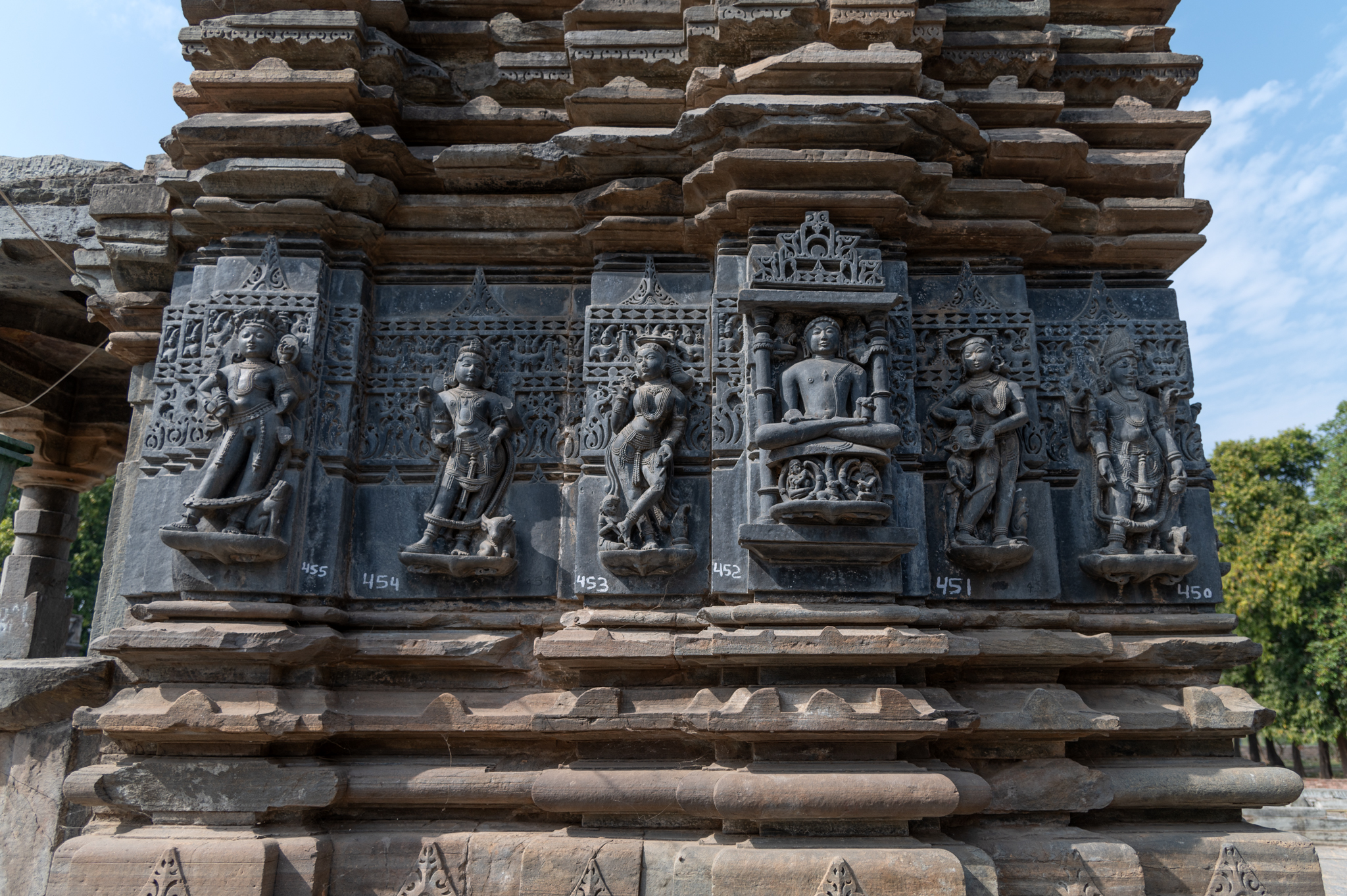The three sides of the main garbhagriha (sanctum sanctorum) of this small shrine have five sculptures each. Seen here is the figural frieze on the back side wall of the temple. Here are dikpalas (deities for cardinal directions) on the corner of offsets, apsaras or surasundaris (celestial damsels) in the intermediary projections. The three principal projections on three sides contain images of Chamunda, Natesha or dancing Shiva and Lakulisha. The style of sculptures matches with other Paramara period icons. This pattern of carving dikpalas, apsaras and deities from the Shaiva pantheon is unique and found at several structures within Arthuna.