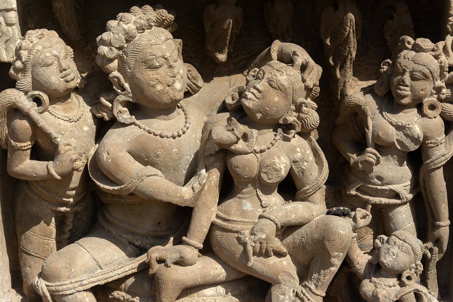 Couples invoking shringara rasa (associated with romance, love, and attractiveness between lovers) are framed in panels with pillars and tiered shikhara with gavashka (horseshoe) motifs. Unlike in other parts of the temple, the faces of the couples are not damaged and they are wearing heavy jewellery, elaborate headgear, and garments, indicating they belong to royalty. The central male figure is seated in a lalitasana pose on a raised seat. The central female figure is seated on his left thigh, looking towards the man with her head turned. The man is admiring the beauty of the woman, placing his left hand on her coiffure and inspecting her face with his left hand (missing). Chauri dharini (fly whisk bearers) stand on either side of the couple, looking towards them. A small female figure features at the right bottom, likely an attendant or servant.