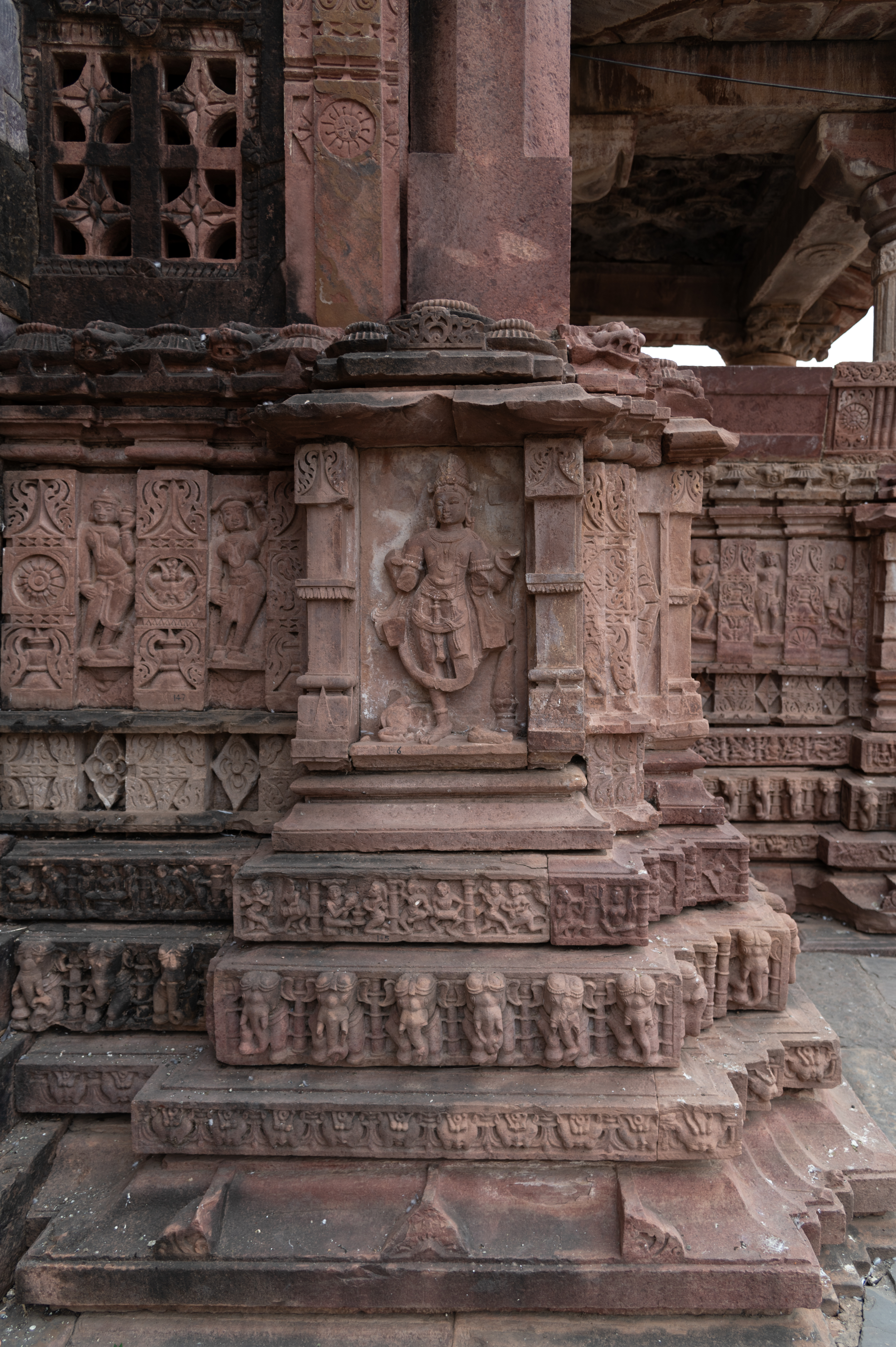 The corners of the dwarf walls of the mandapa (pillared hall) of the Mahanaleshwar Temple have icons at their joining juncture. These images are mostly of dikapalas (gods of cardinal directions), the directional deities, but since the icons are mutilated, it is difficult to identify them. The west-facing devakoshtha (niche) seen here probably had the icon of Ishan, the god of the north-east direction. The base of the dwarf walls with devakoshthas (niches) have two sets of pillars at their edges. One of these is a half pillar that rests over the kakshasana (seat backs) from the interiors of the temple and the other is a pilaster that connects to the perforated windows of the mandapas.