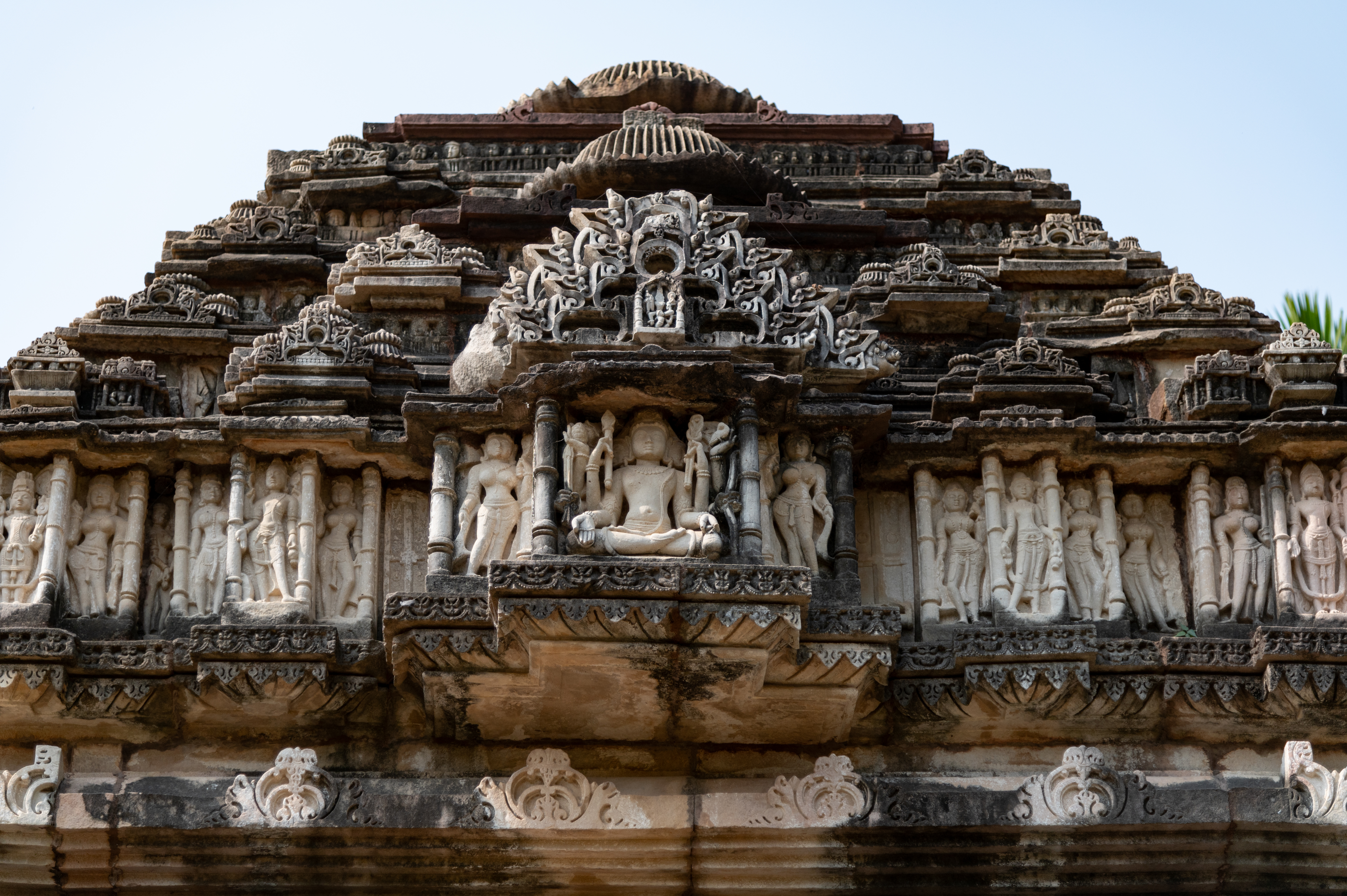 A beautiful sculpture of Kartikeya can be seen on the western pediment of the shikhara (superstructure) of the rangamandapa (open type of pillared hall). The God of war is depicted seated, with four faces, three of which are visible in the sculpture. He has eight arms and holds his weapons including a shakti/vel (spear), arrow, and bow. He is holding a cork in one of his hands and his frontal hands are carrying an akshamala (rosary) and a kamandalu (water pot). The slender body of the young war God is adorned with jewellery and yajnopavita (sacred thread). It is one of the most beautiful representations of Kartikey.