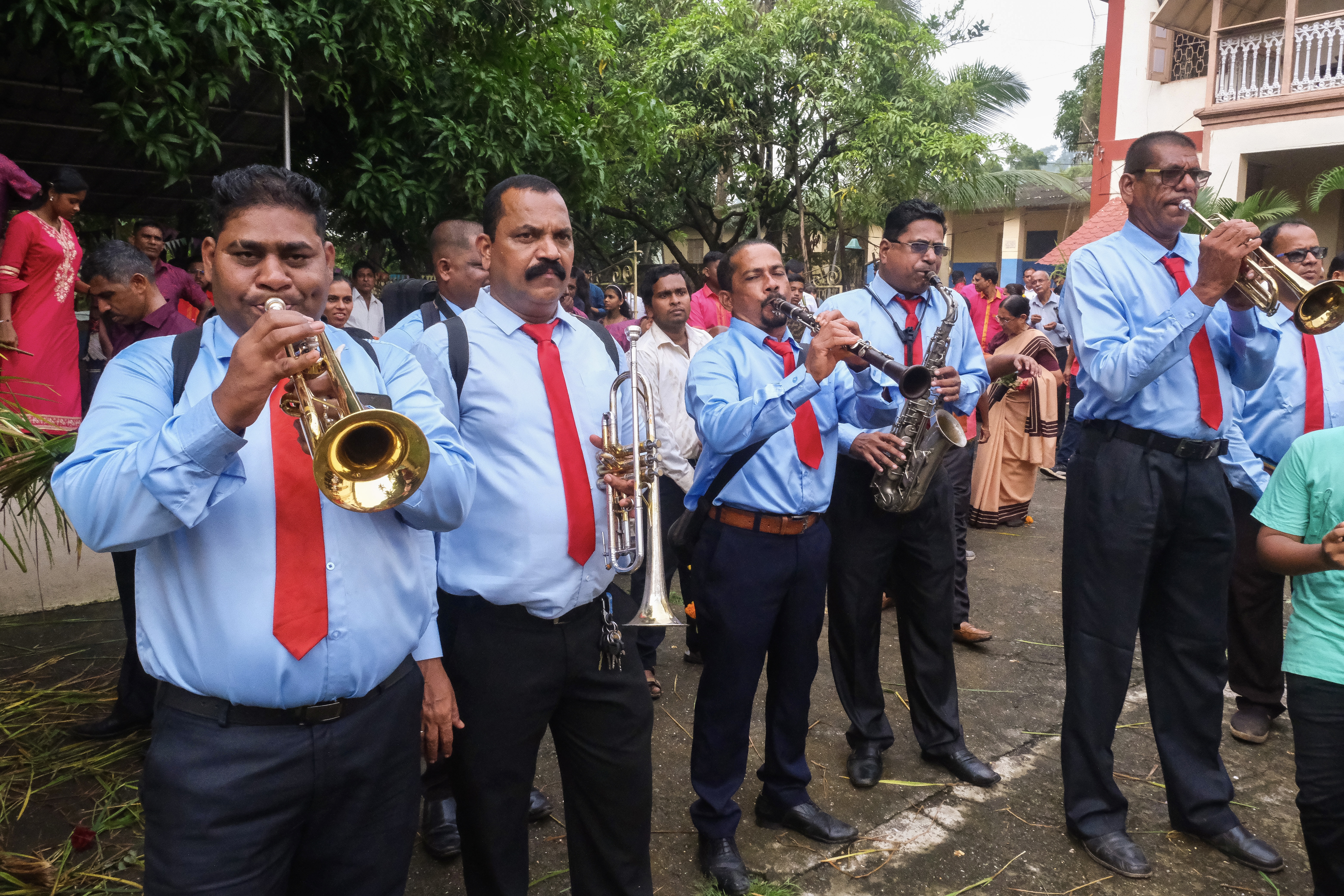 The band plays a variety of wind instruments, primarily trumpets, saxophones, and clarinets. Drums and cymbals are also included in the ensemble.