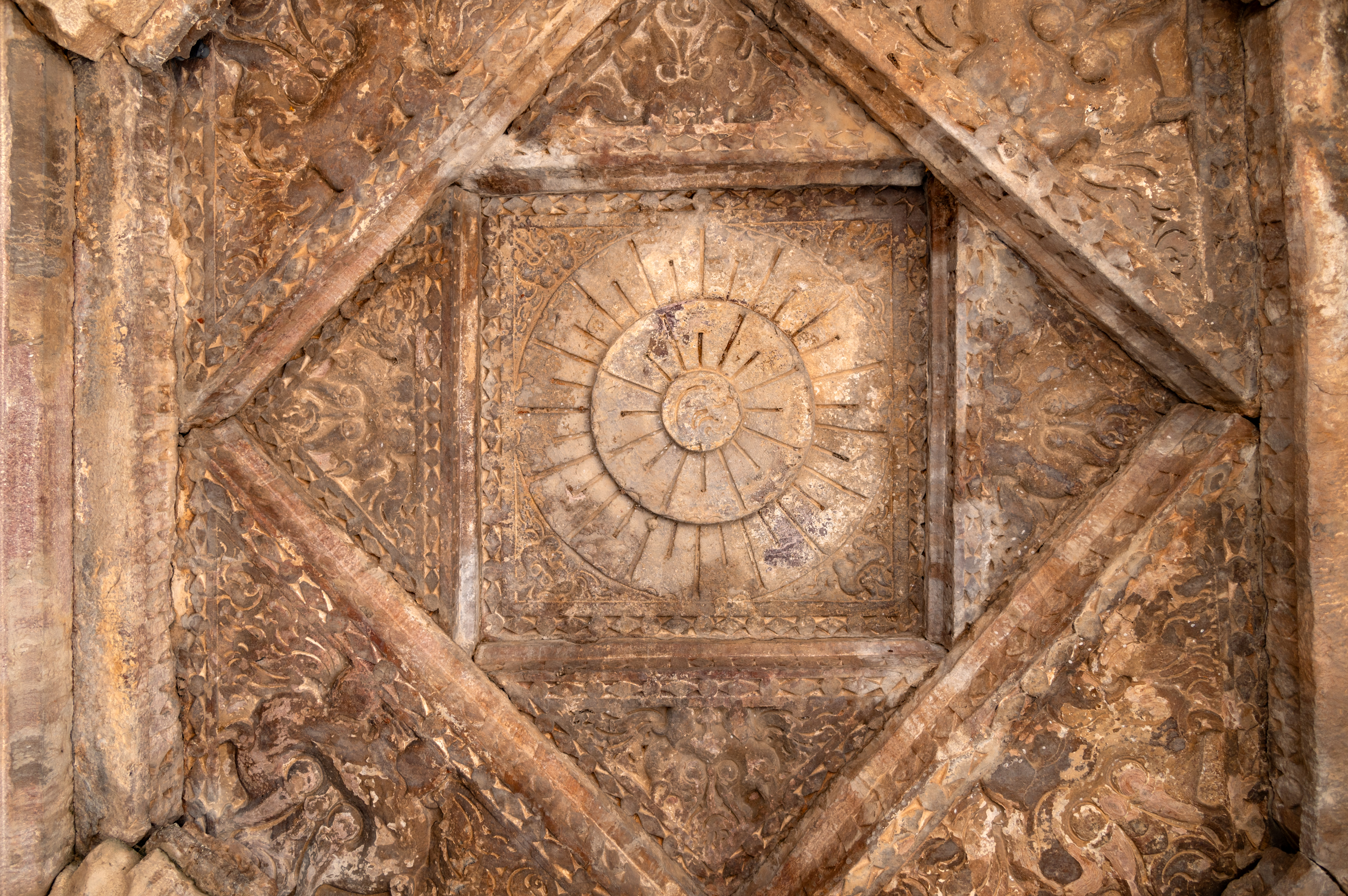 The Hazareshwar Temple is constructed in the trabeate style, which is most evident in its ceiling design. The pillars and pilasters of the mandapa (pillared hall) support four lintels, forming a large square with concentric squares. Each square features a kirtimukha (face of glory) at its corners, and at the centre of the ceiling, there is a beautifully carved lotus bloom.