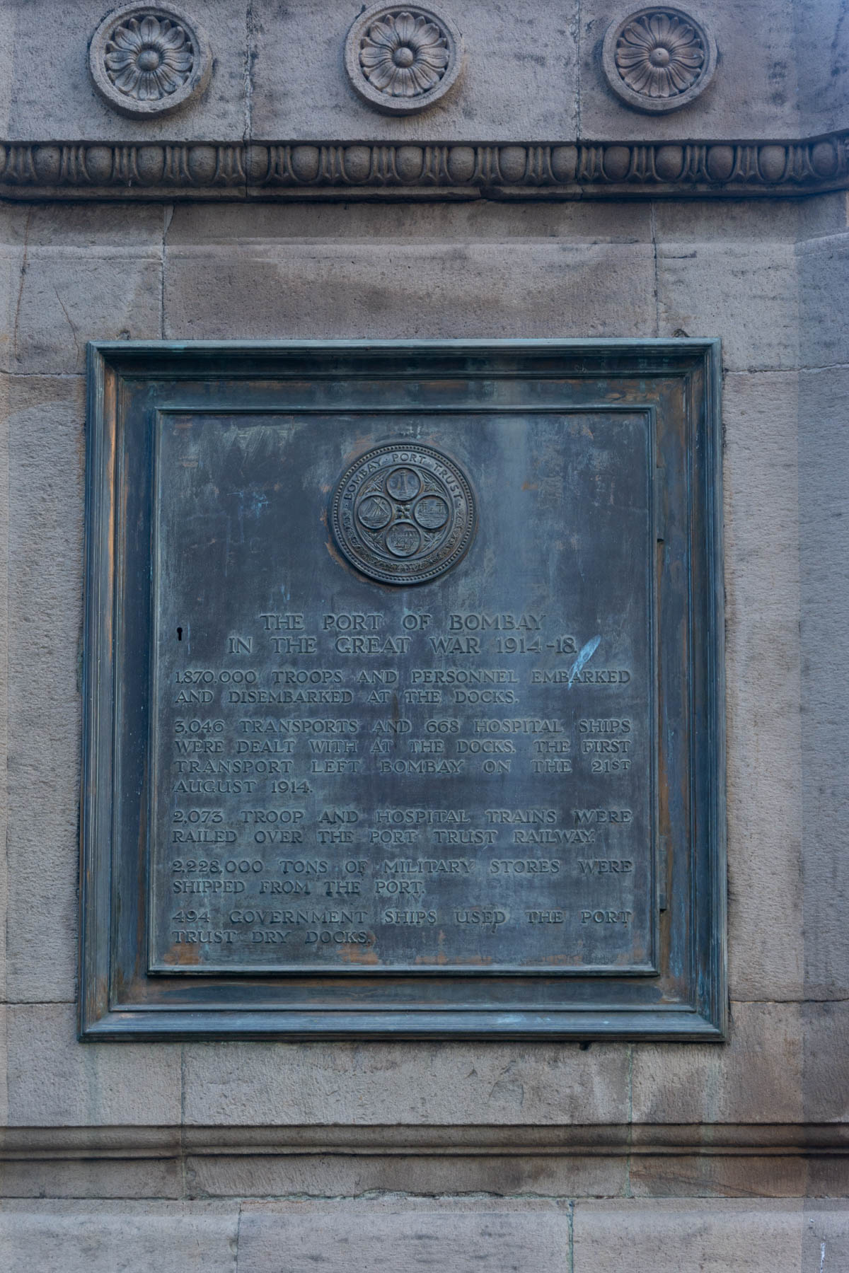 The development of Ballard Estate coincided with the outbreak of World War I (1914-18) in which India sent troops on behalf of the British Empire. The Port Trust War Memorial records the significant contribution of the Port of Bombay in WWI. It mentions the passage of 18,70,000 troops and personnel through the docks to different theatres of the war. The first transport left Bombay on August 21, 1914.