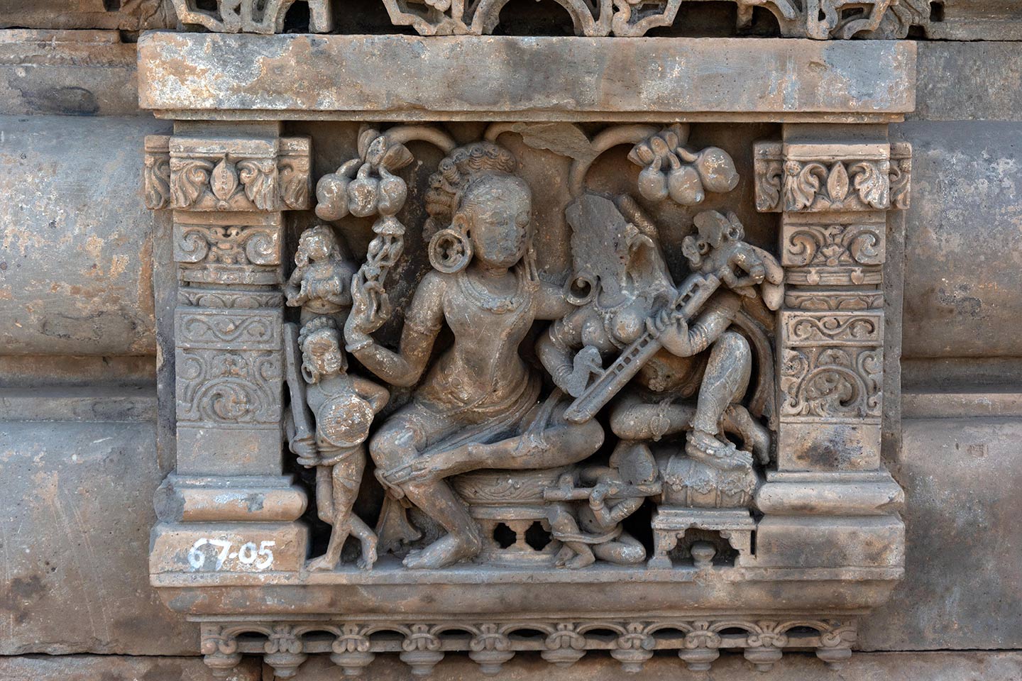 Couples invoking shringara rasa (associated with romance, love, and attractiveness between lovers) are framed in panels with pillars and tiered shikhara with gavaksha (horseshoe) motifs. The face of the female figure is missing and the face of the male figure is defaced. They are wearing heavy jewellery, elaborate headgear, and garments, indicating they are a royal couple. The central male figure and female figures are enjoying a musical concert in a grove. They are seated on circular raised seats, and the male is seated in the lalitasana pose. The female figure is leaning towards the male and playing a stringed musical instrument (likely a veena). They are surrounded by four smaller figures. A male soldier is holding a sword and shield (on the left). One musician is playing the flute (bottom), sitting between the seats. A small female attendant (top right) is whispering in the ear of the central female. Mangoes are hanging from the tree branches.