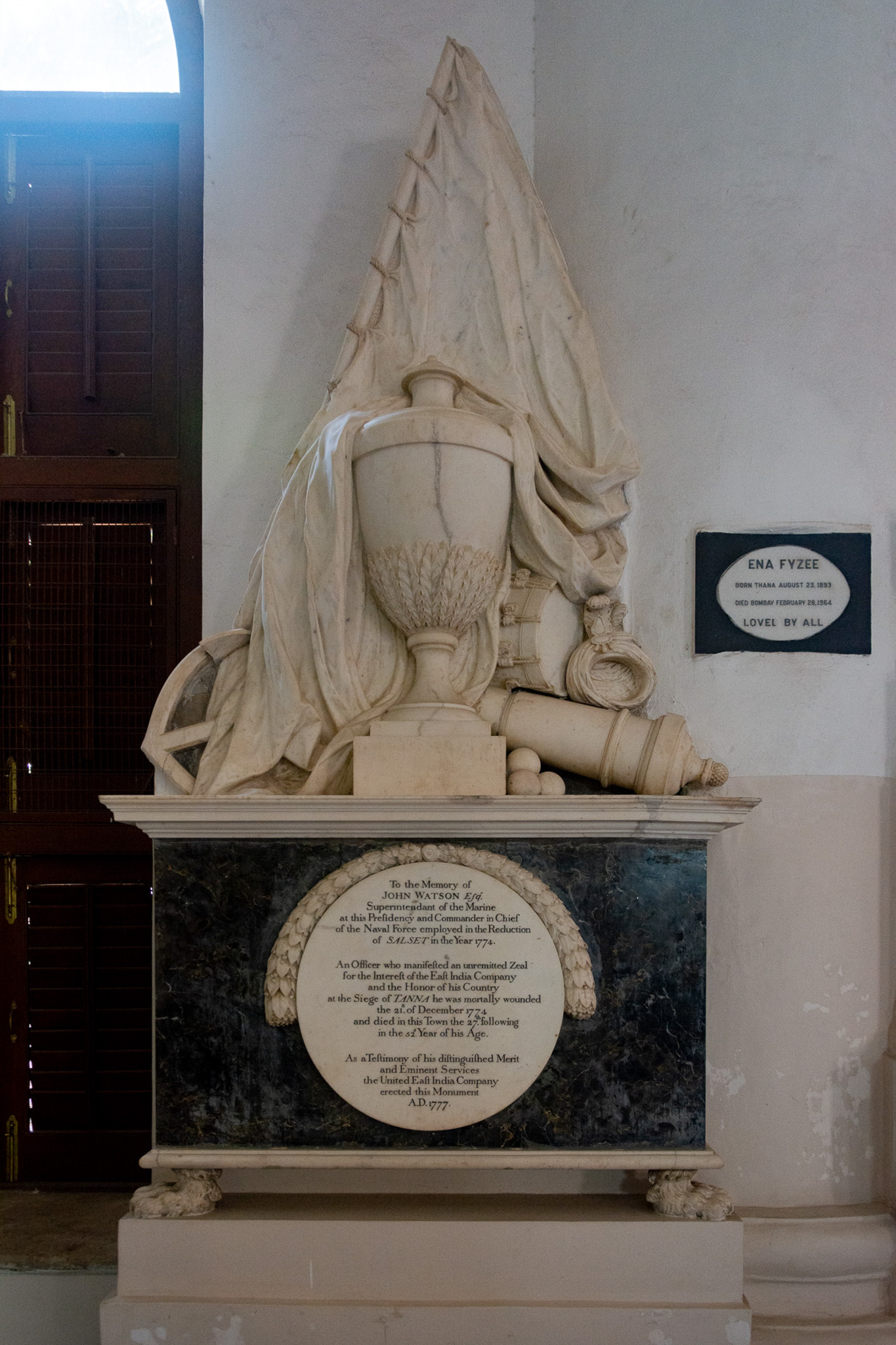 Memorial dedicated to John Watson, Superintendent of the Marines and Commander-in-Chief of the naval force that attacked Salsette in 1774. He participated in the Siege of Thane and was mortally wounded on 21st December 1774 and died from his wounds six days later on 27th December, at the age of 52. In 1777, the monument was erected in his honor by the East India Company.