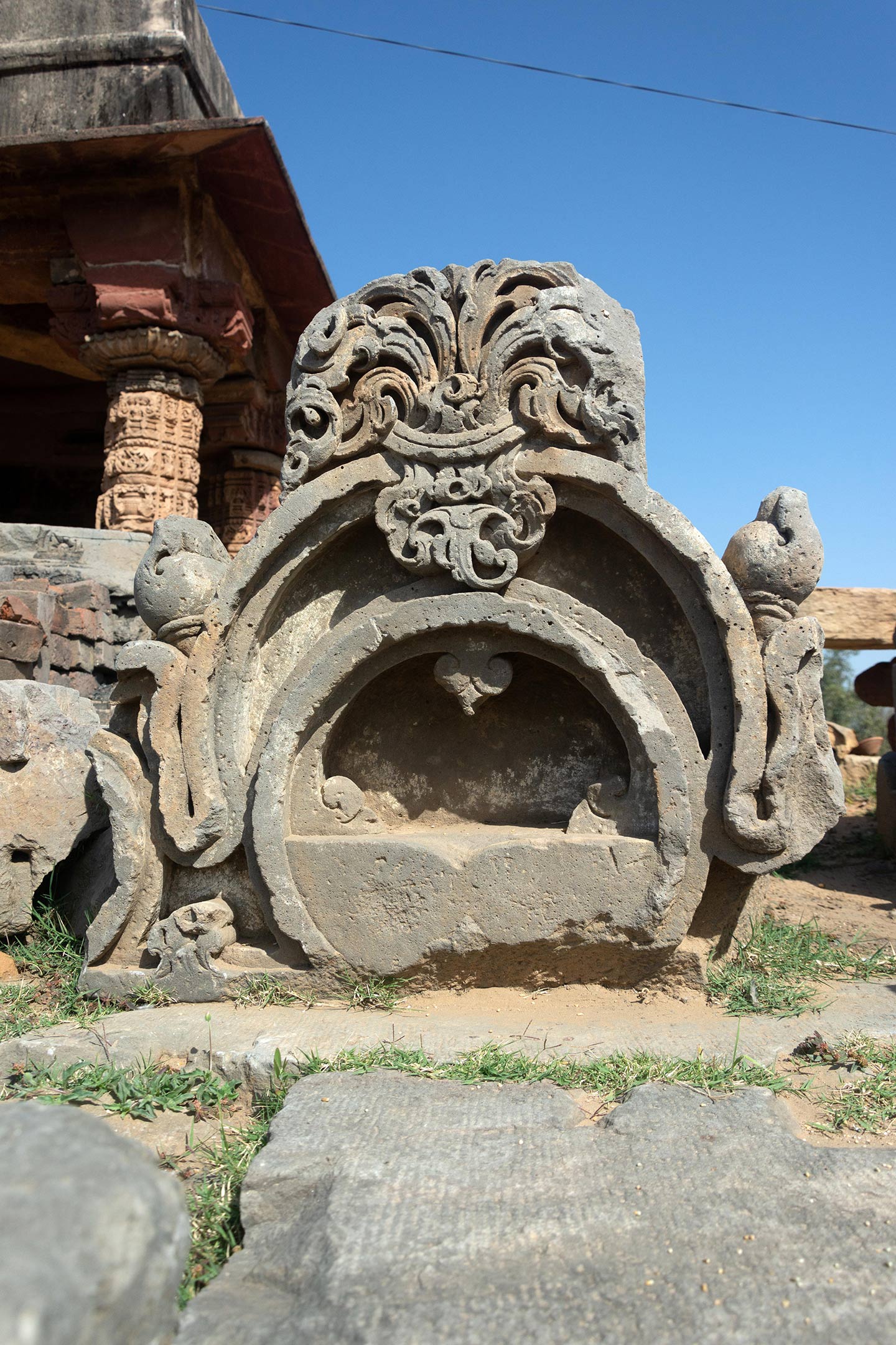 Debris from the original temple was salvaged when the current temple was reconstructed in the 1940s. These are assembled to form the jagati (raised platform), hence they are not in their original position. This fragment, for example, known as sukanasa (or sukanasi), was part of the shikhara, located above the entrance to the garbhagriha or inner shrine. The sukanasa (or sukanasi) is usually featured above the entrance to the garbhagriha or inner shrine and often contains the figure of the presiding deity to which the temple is dedicated (missing in this sukanasa). The corners of the arch have inverted conch motifs. The top of the arch has an elaborate kalapavriksha (tree of life) motif.