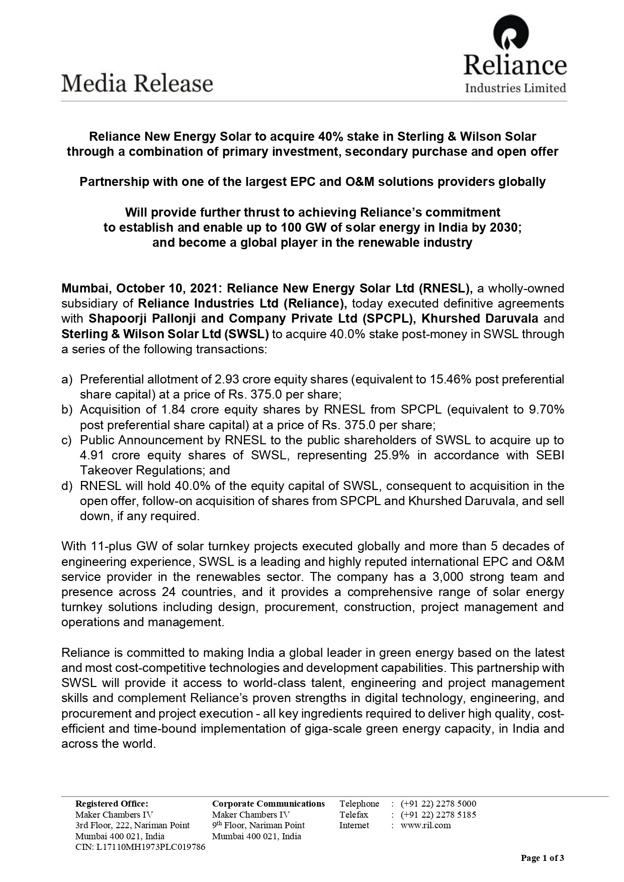 RIL, through its subsidiary company Reliance New Energy Ltd (RNEL), announces acquisitions and partnerships to develop the New Energy ecosystem. • USD 144 million investment in energy storage company Ambri Inc along with strategic investors Paulson & Co. Inc. and Bill Gates, and a few others, as part of Reliance’s long-duration energy storage systems business globally • USD 771 million acquisition of REC Solar Holdings AS (REC Group), one of the world’s leading solar cells/panels and polysilicon manufacturing companies • 40% stake acquisition in Sterling & Wilson Solar, one of the largest EPC and O&M providers globally, to provide turnkey solutions in the New Energy value chain • USD 29 million (EUR 25 million) investment in Germany’s NexWafe and a partnership for the joint technology development and commercialization of high-efficiency monocrystalline “green solar wafers” • Collaboration with Denmark’s Stiesdal A/S on development and manufacturing of their HydroGen Electrolyzers in India, which will produce hydrogen at a significantly lower cost compared to current levels, thus paving the way for rapid decarbonization and commercialization of affordable Green Hydrogen • GBP 100 million acquisition of leading global sodium-ion battery technology company Faradion Ltd, and an additional GBP 25 million investment as growth capital to accelerate commercial roll out.