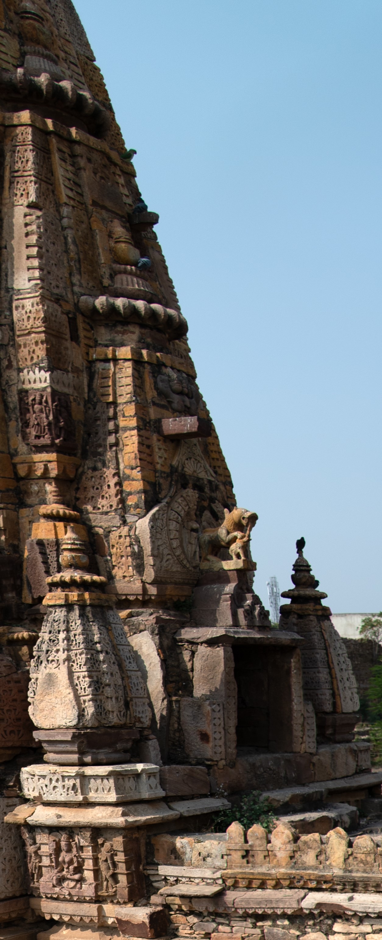 The frontal face of the shikhara (superstructure) reveals the placement of two half spires flanking the main spire. At the base of the spire, a surasenaka (pediment made of chaitya dormer) adorns the structure, while a sculpture depicts a simha (lion) pouncing upon an elephant, adding a touch of regal splendour to the architectural composition.
