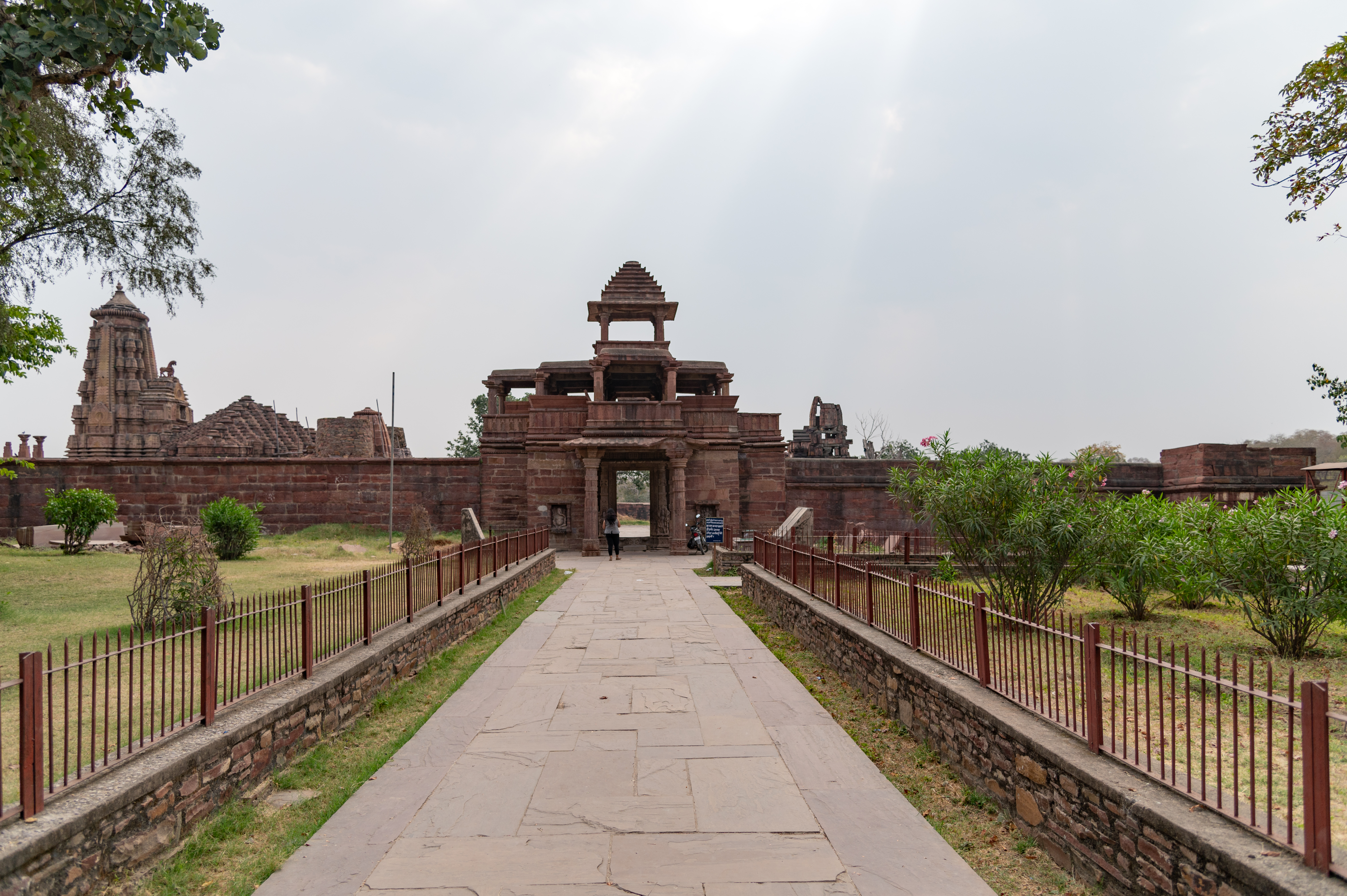 Pictured here is a view of the two-storeyed entrance gateway to the Mahanaleshwar temple complex. The gateway is part of an enclosure wall that demarcates the boundaries of the complex on all four sides. Inside the enclosure walls are several temples, of which the shikhara (superstructure) of the Mahanaleshwar Temple is visible from the outside.