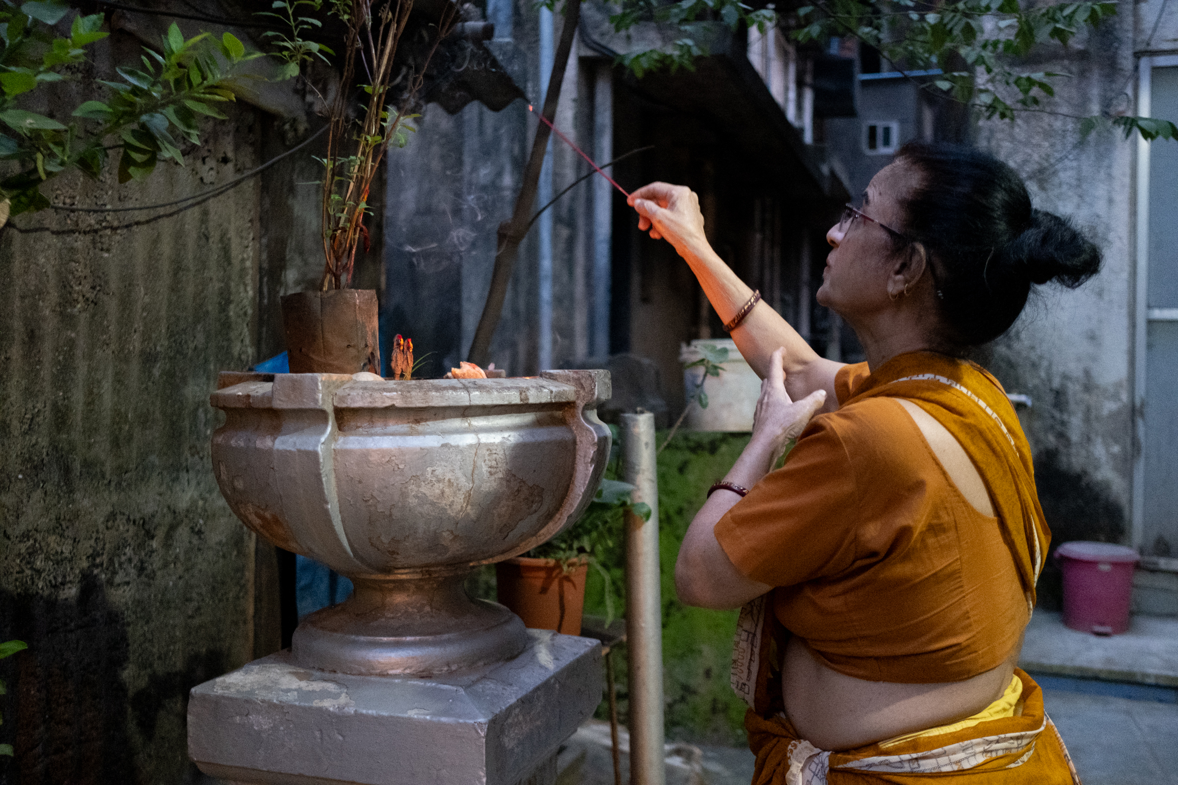 In Koli tradition, the Tulsi plant holds great reverence and is situated in the courtyard of the home. Every evening, Meena Nakhva offers prayers at the Tulsi shrine, lighting incense sticks and a diya (oil lamp).