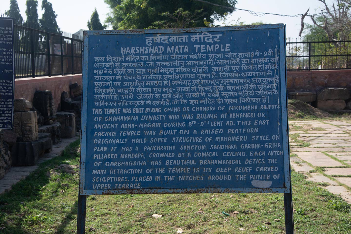 Information board installed by the Archaeological Survey of India (ASI) written in Hindi and English. The board provides information about the Harshat Mata Temple site and gives a basic introduction to the style of temple construction.