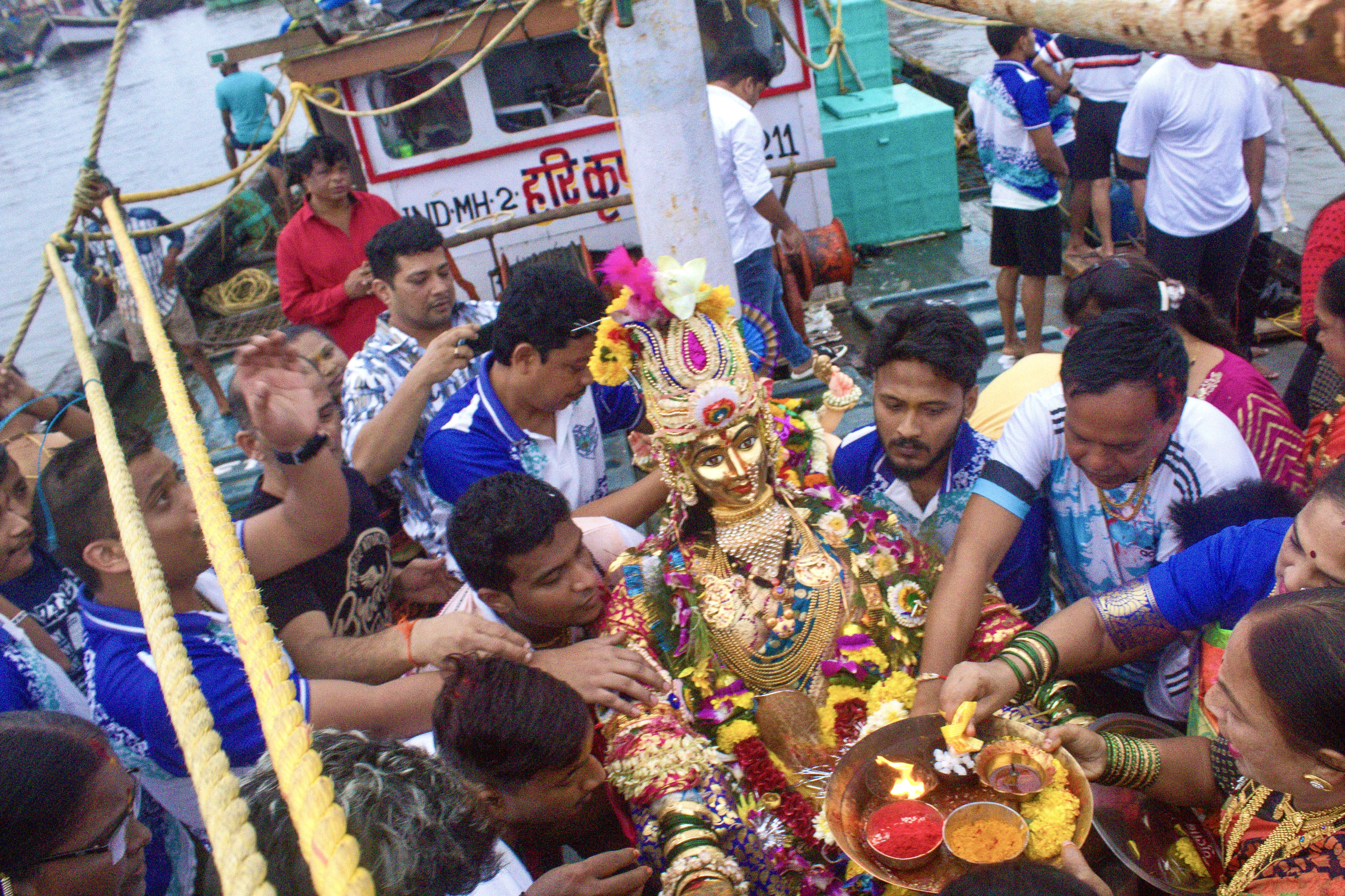 The boat owners consider it a great honour to receive the Goddess on their boat. Aaarti (waving the sacred fire in front of the deity) is performed when the Goddess arrives on deck, and blessings are taken from the scared fire of the aarti.