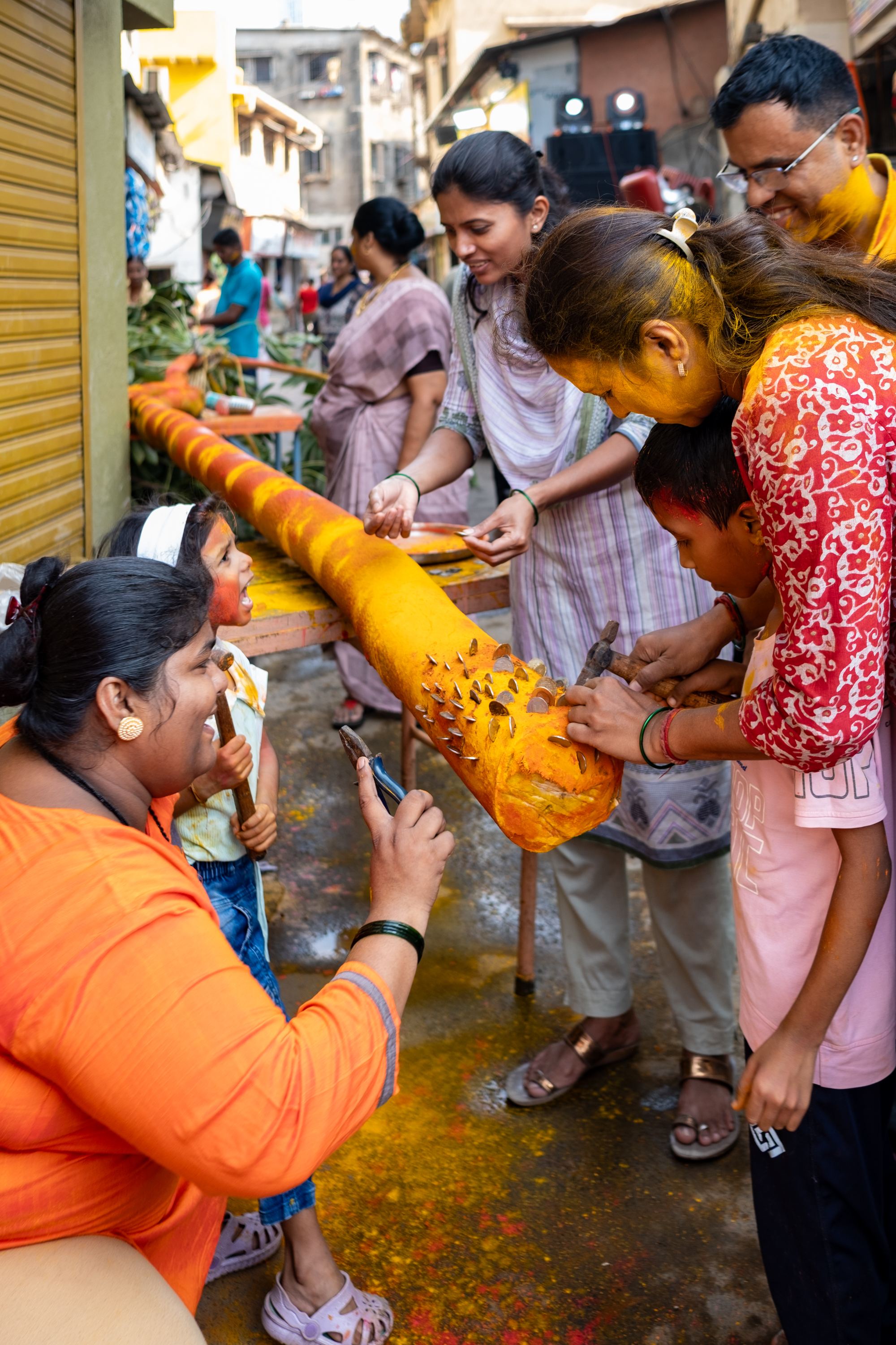 The trunk is smeared with haldi (turmeric); similar to how a prospective bride is smeared with turmeric during the haldi chadavane (haldi ceremony) before a Koli wedding.