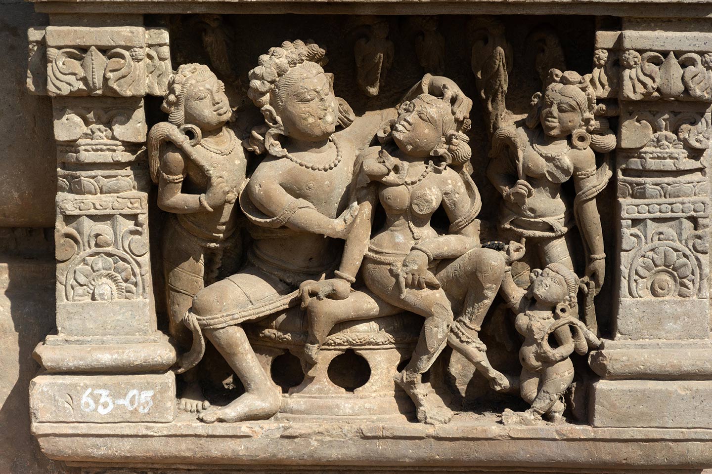 Couples invoking shringara rasa (associated with romance, love, and attractiveness between lovers) are framed in panels with pillars and tiered shikhara with gavaksha (horseshoe) motifs. Unlike other sections of the temple, the faces of these couples are not damaged and they are wearing heavy jewellery, elaborate headgear, and garments, indicating their royal lineage. The central male figure is seated in the lalitasana pose on a raised seat. The central female figure is seated on his left thigh, looking towards the man with her head turned. The man is admiring the beauty of the woman, placing his left hand on her coiffure and inspecting her face with his left hand (missing). Chauri dharini (fly whisk bearers) stand on either side of the couple, looking towards them. A small female figure features at the right bottom and is likely an attendant or servant.