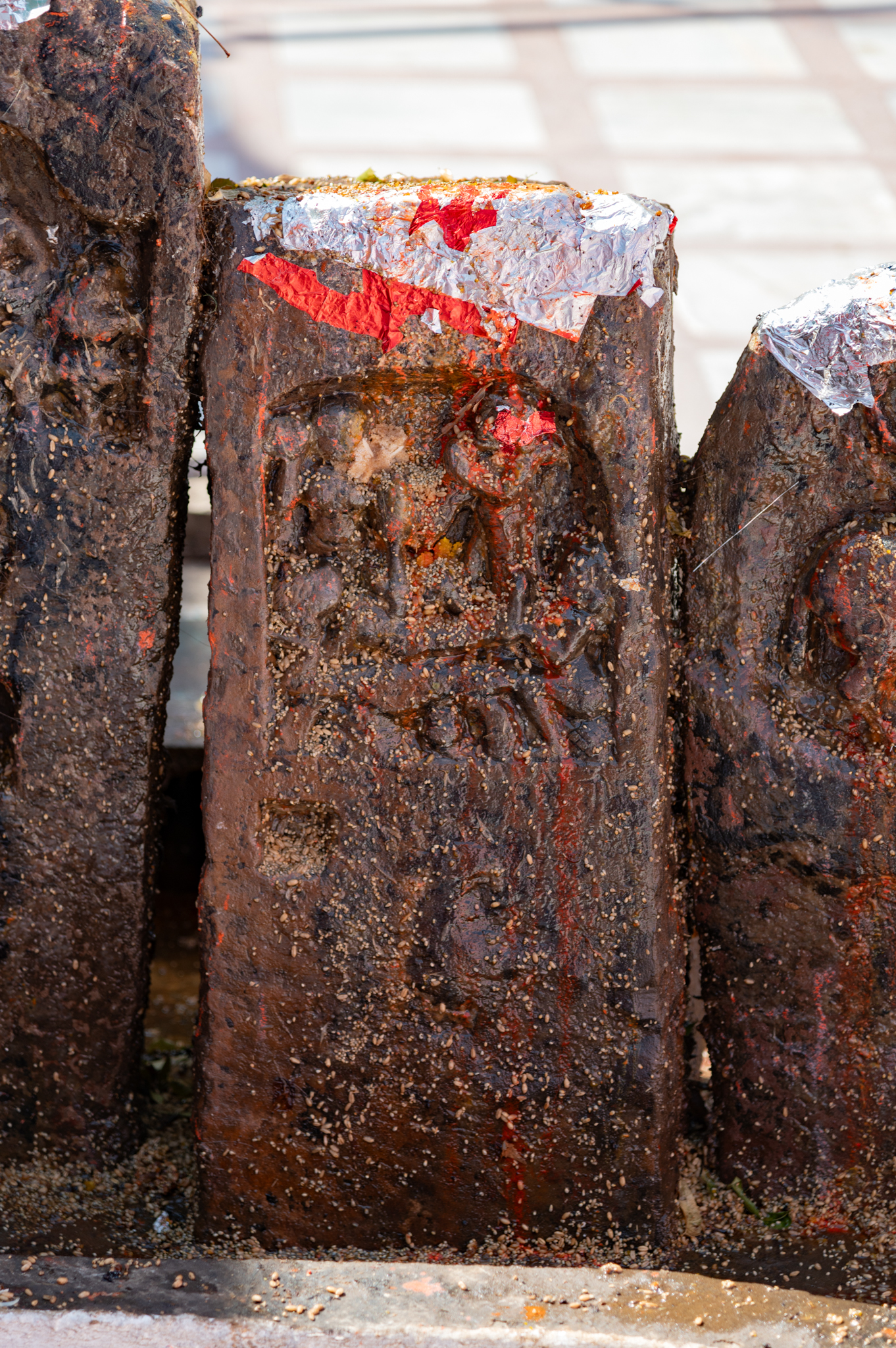Seen here is a small size hero stone, similar in dimensions to the adjacent hero stones. It is a rectangular stone slab without a triangular finial. The panel depicting the hero and his journey to the heavenly abode differs slightly from others. Here, there is no figure mounted on a horseback; instead, there is a supine human figure next to another figure standing with folded hands. The depiction likely indicates the hero’s death and his attainment of moksha (freedom from the eternal cycle of life, death, and rebirth). This unique portrayal is not found on any other hero stones fragment in the Suswani Mata Temple.